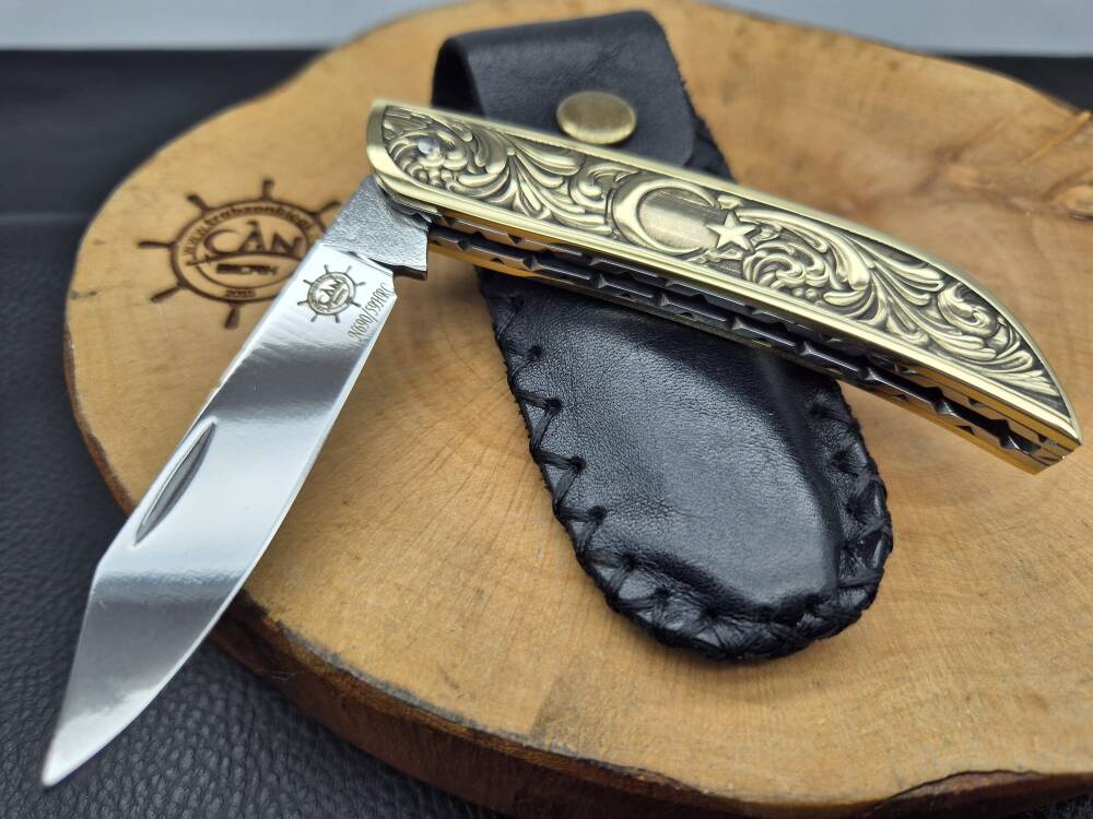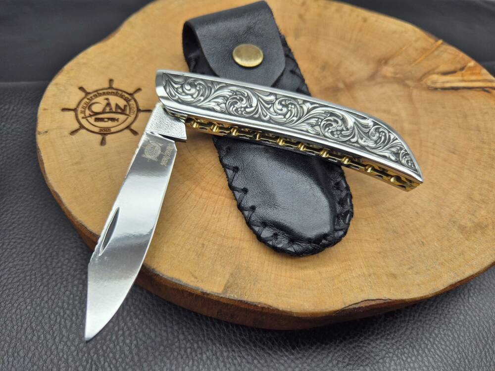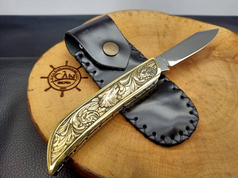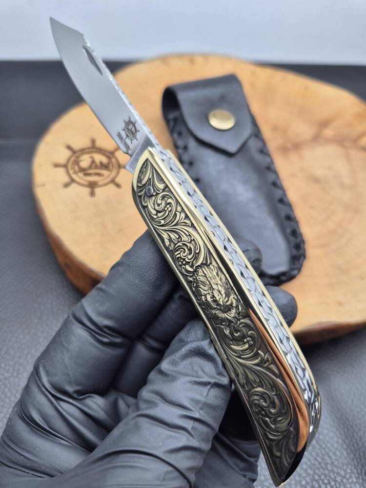 3D Gravür işleme pirinç kabza, iç kasa-sırt işlemeli, namlu sırtı desenli ayna parlak N690 çelik avcı model Sürmene çakısı