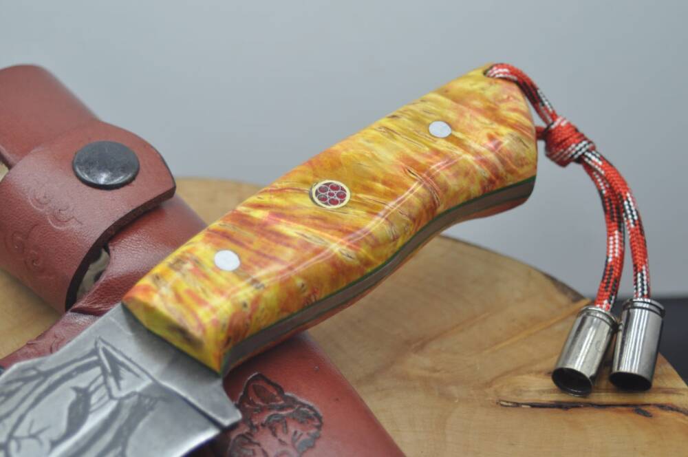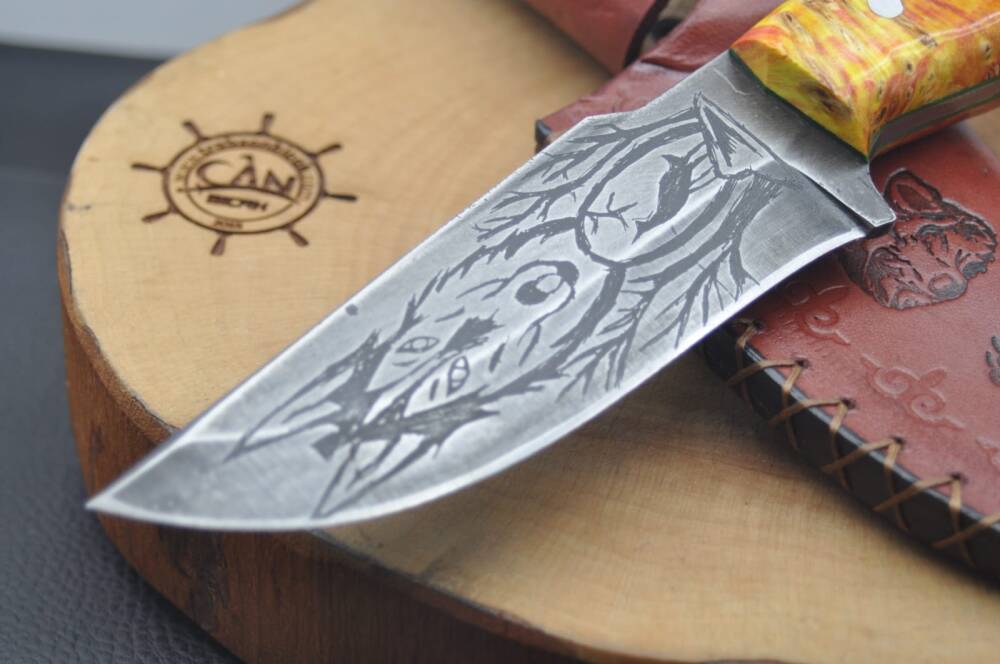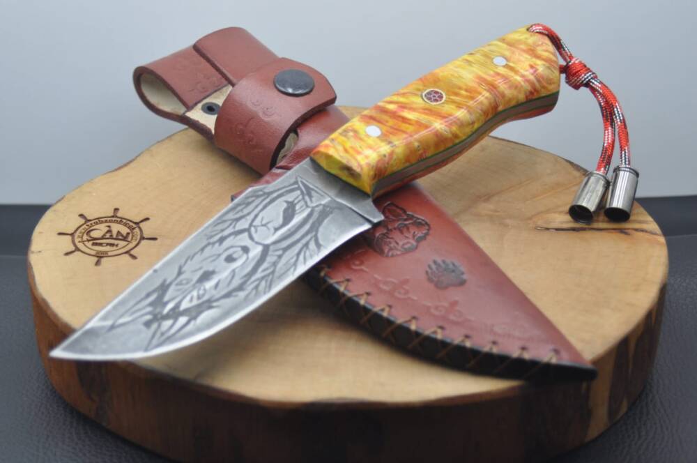 A2 Neşter Çelik asit indirme çift taraf gravür işlemeli namlu, stabilize akçaağaç kabza, yeşil linear, mozaik pim, vaketa deri kılıflı, paracord ip aksesuar-kovan kombin, el yapımı av ve kamp bıçağı.
