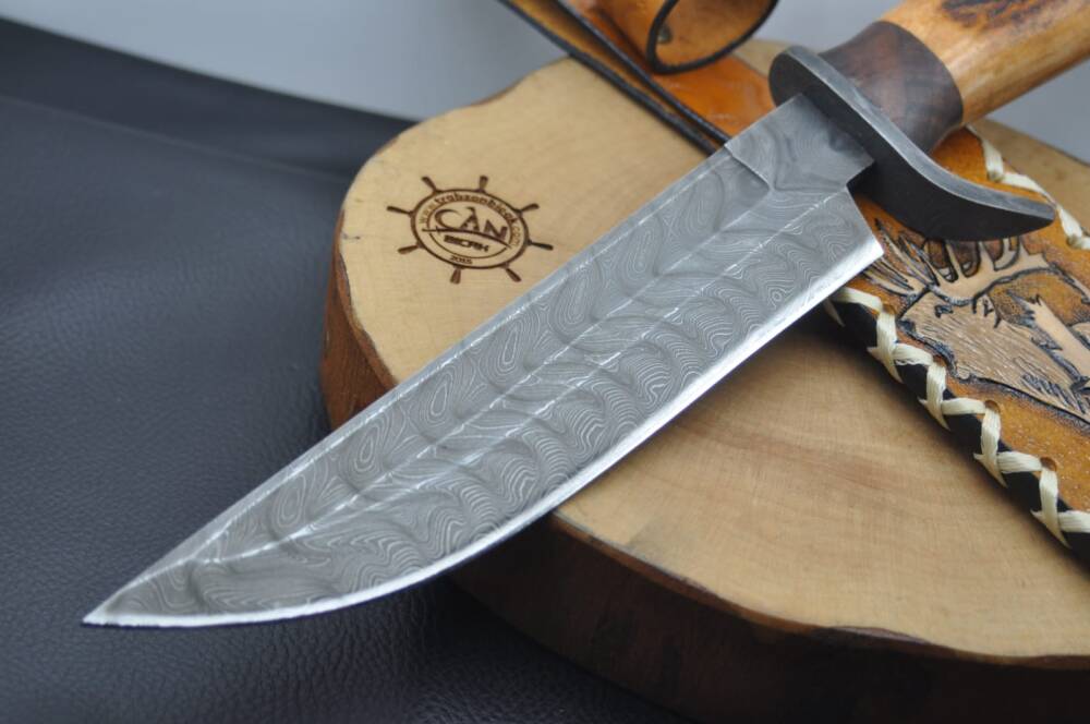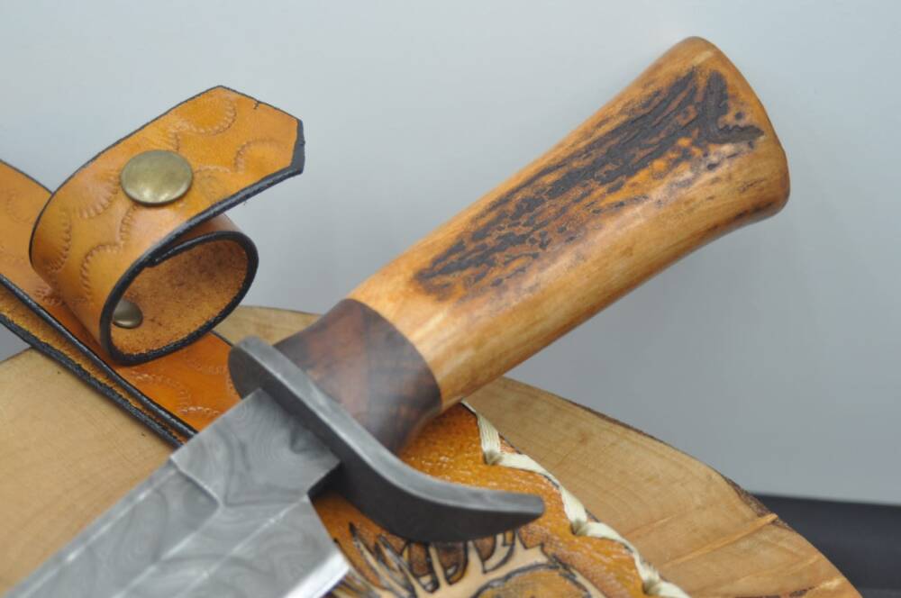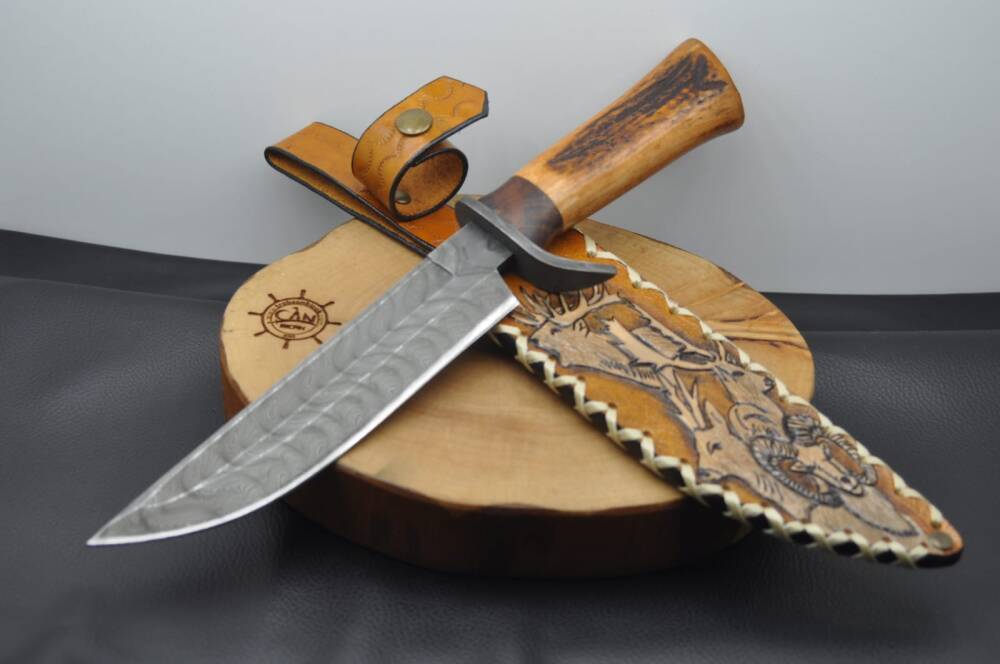 Damascus çelik oluklu namlu, geyik boynuzu kabza, damascus çelik balçak, craft deri kılıflı, el yapımı av ve kamp bıçağı.