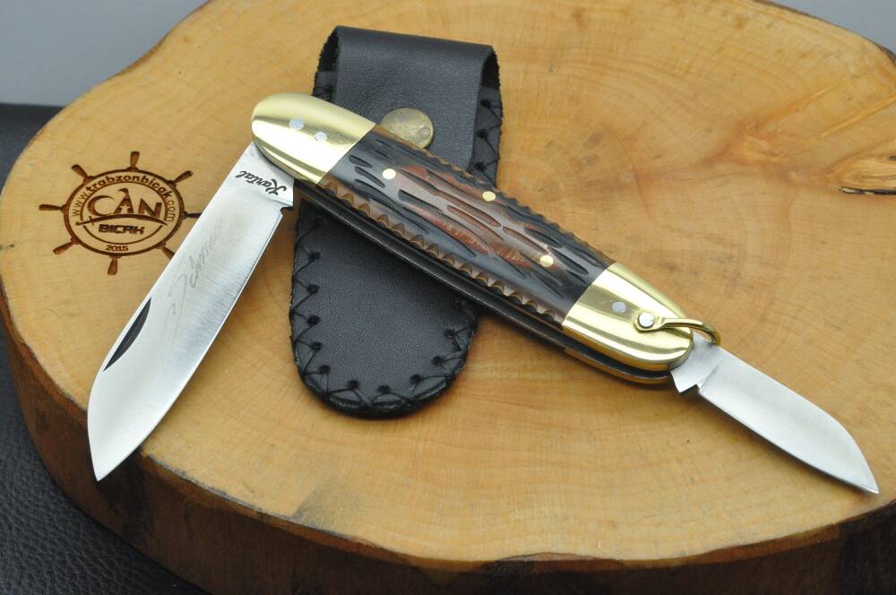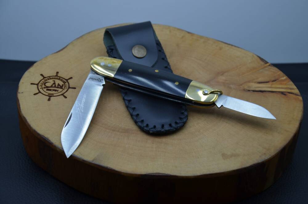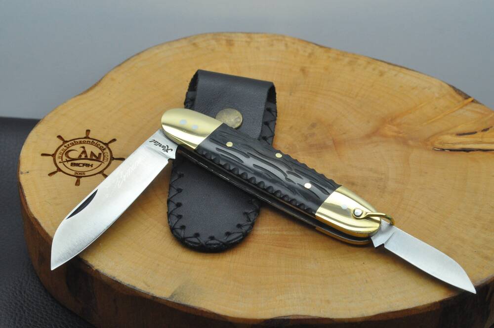 4116 çelik namlu, dramel işleme verzalit çift pirinç balçak kabza, deri kılıflı, el yapımı Elmalı model Sürmene çakısı.