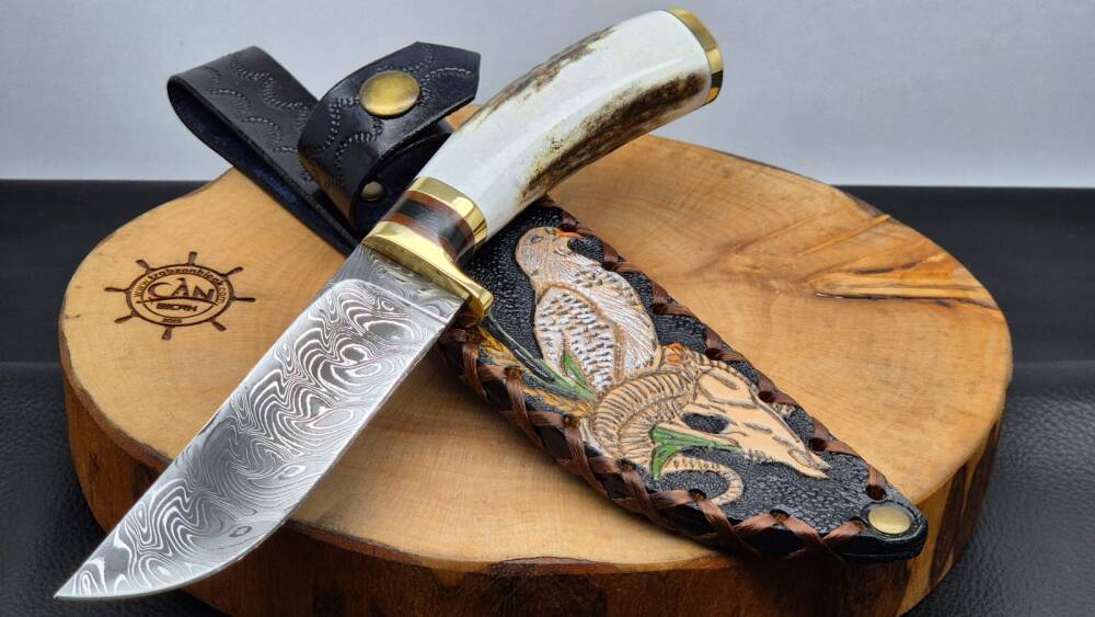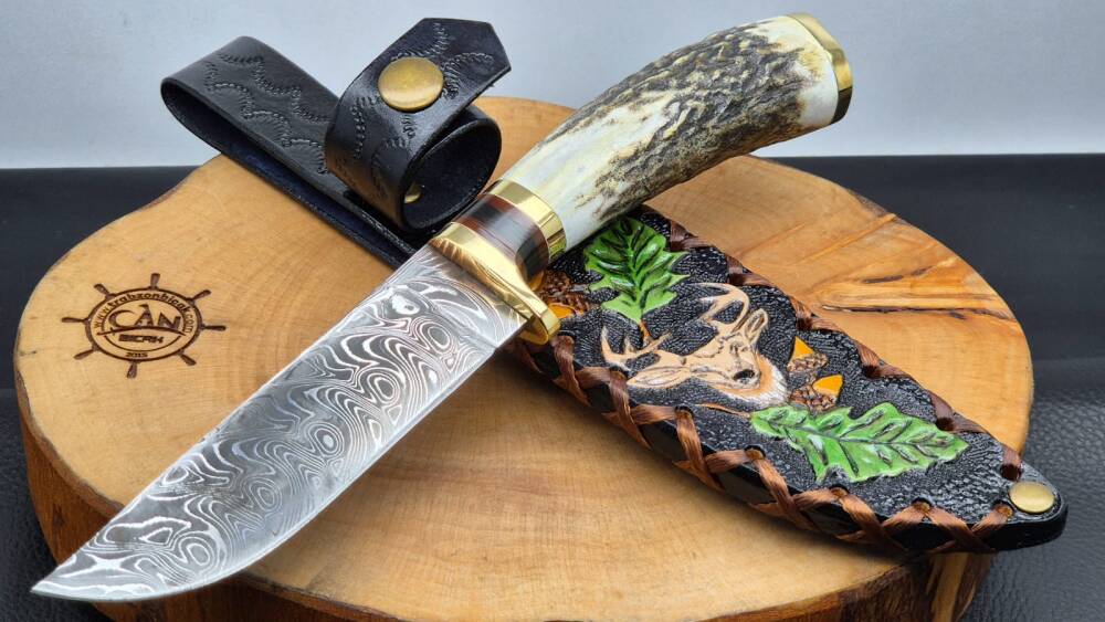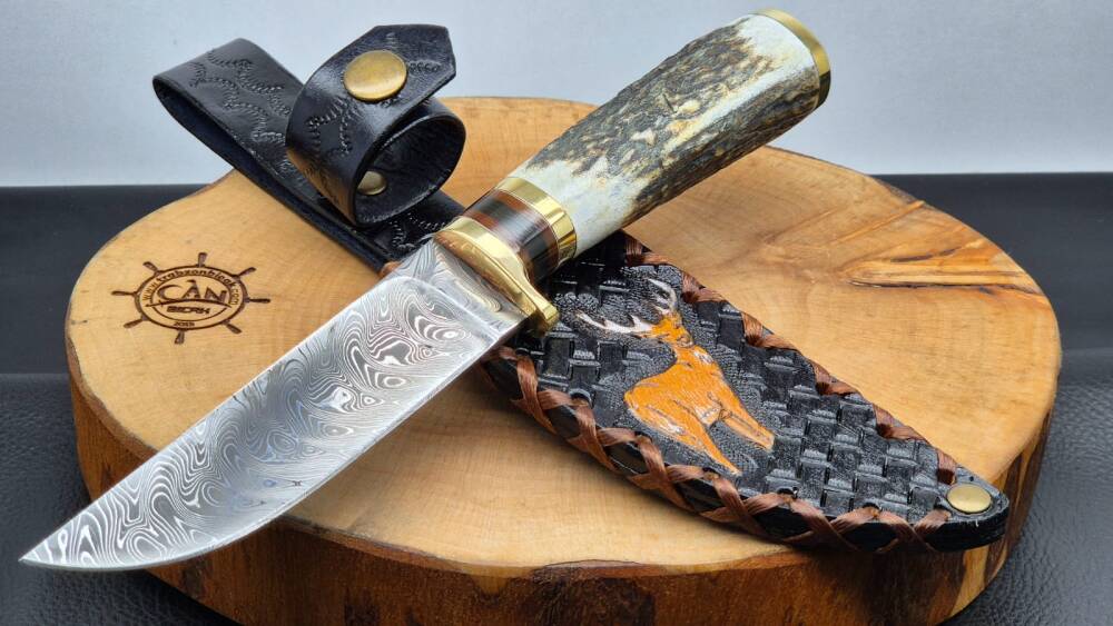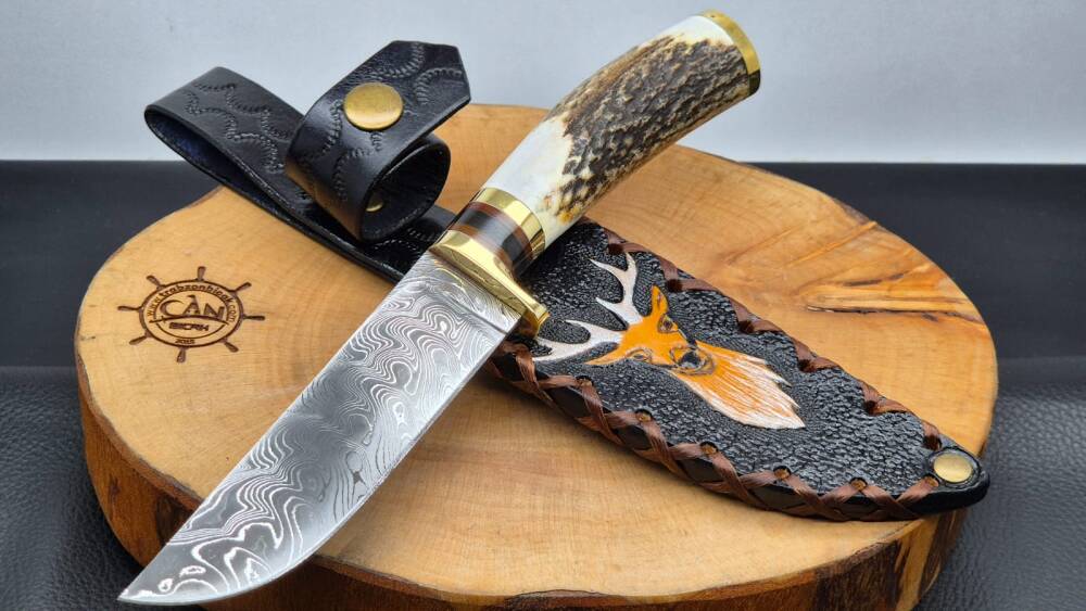 Damascus çelik namlu, geyik boynuzu kabza, pirinç balçak, çift pirinç önlük, craft deri kılıflı, el yapımı av ve kamp bıçağı.