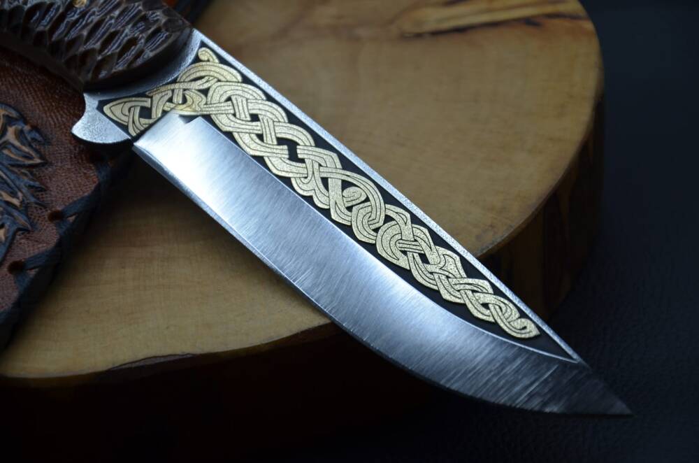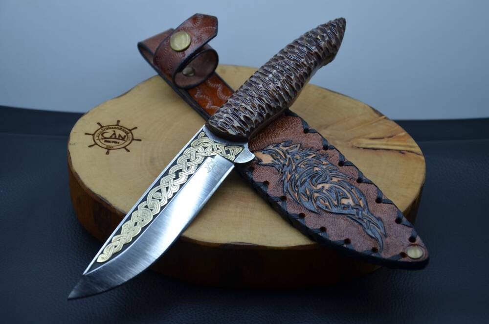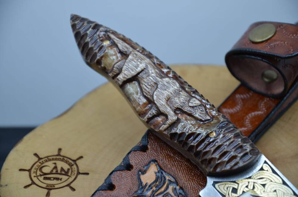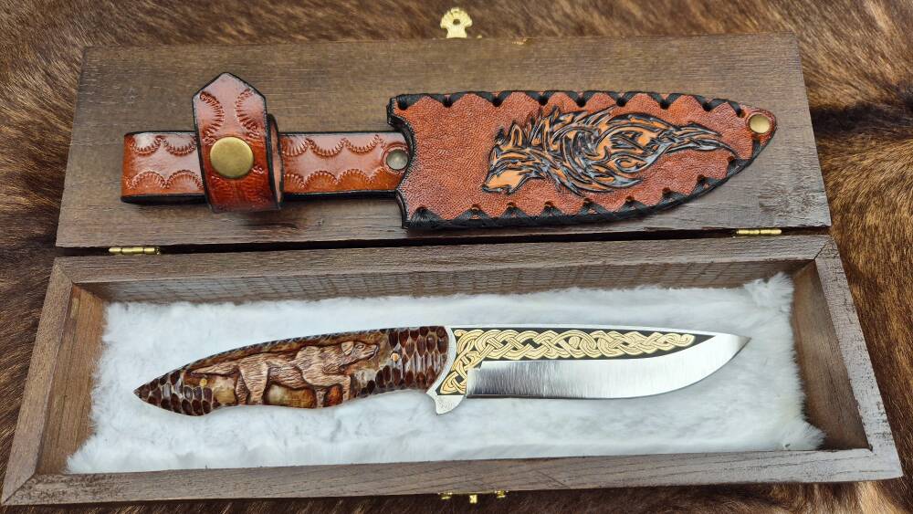14K Altın tribal işleme gravür N690 Böhler çelik bushcraft model namlu, gravür işlemeli Av köpeği benzetme corion kabza, kurt işlemeli craft deri kılıf, el yapımı av ve kamp bıçağı.
