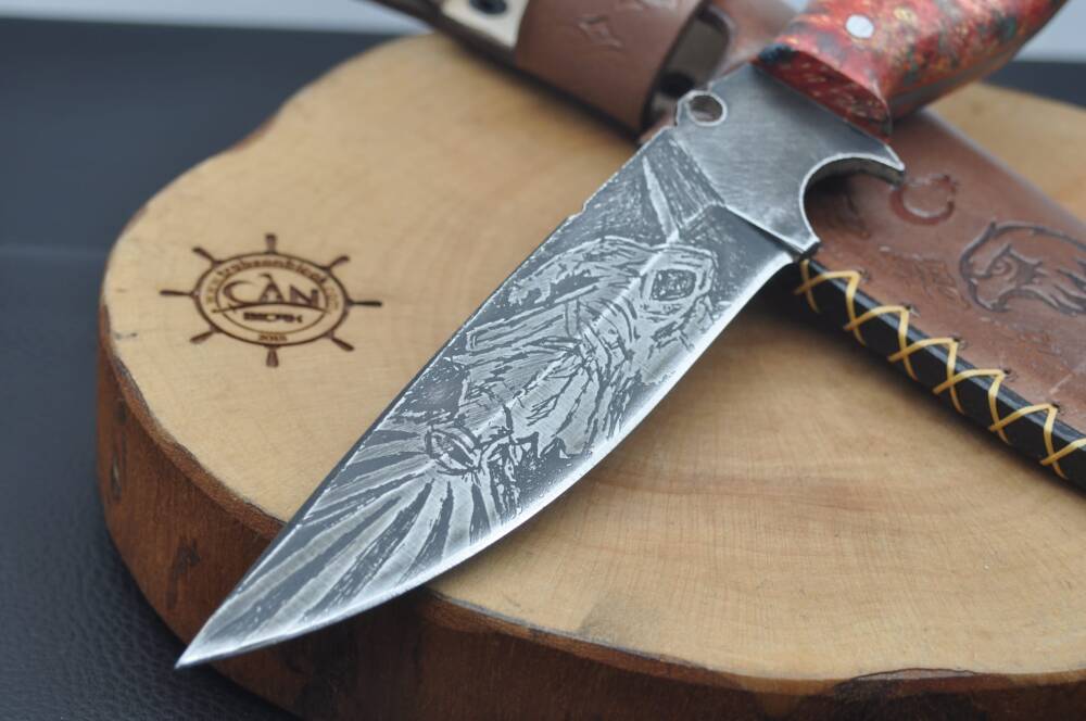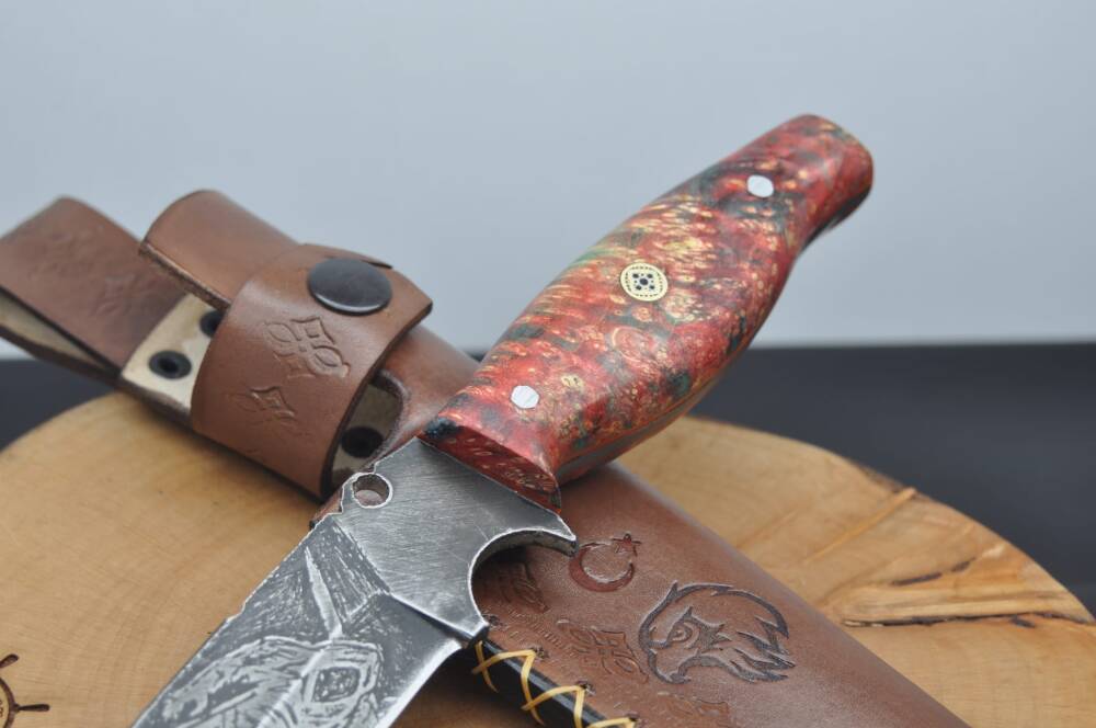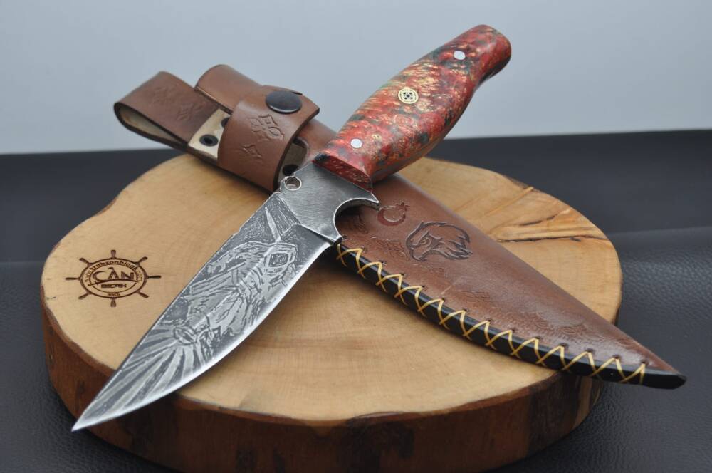 A2 Neşter Çelik asit indirme çift taraf gravür işlemeli namlu, stabilize akçaağaç kabza, turuncu linear, mozaik pim, vaketa deri kılıflı, paracord ip aksesuar-kovan kombin, el yapımı av ve kamp bıçağı.
