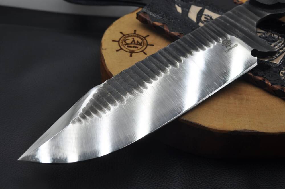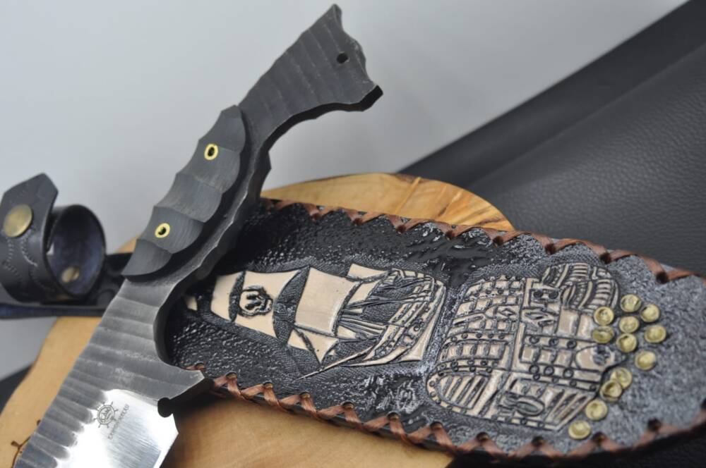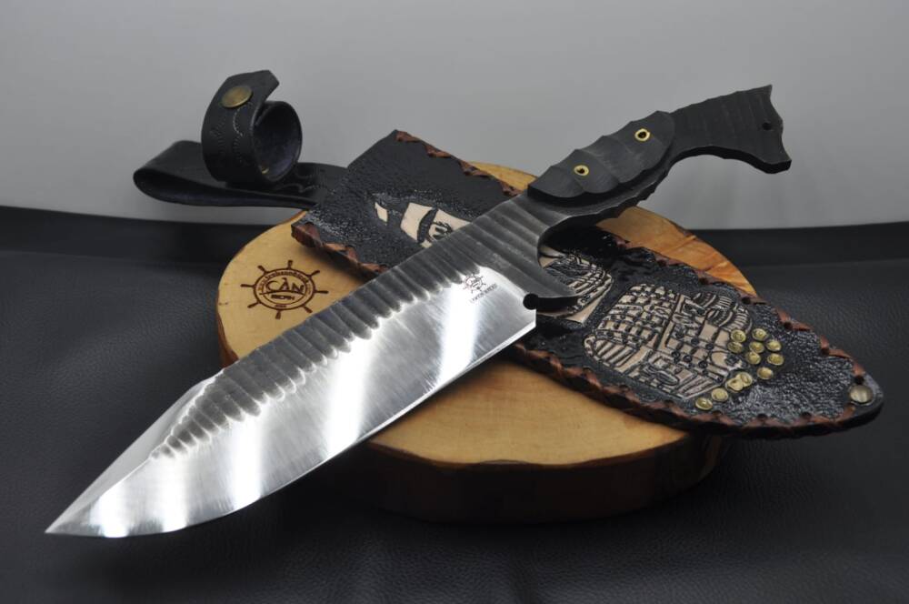 5160 kamyon makas çeliğinden dövme oymalı namlu, compact lamine kabza, craft deri kılıflı el yapımı av ve kamp bıçağı.