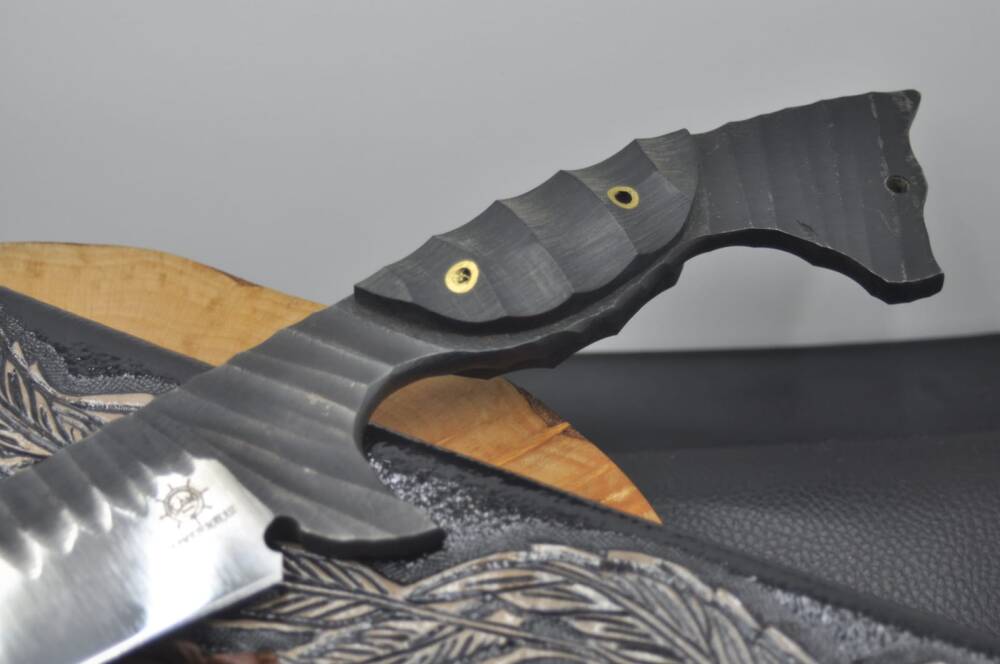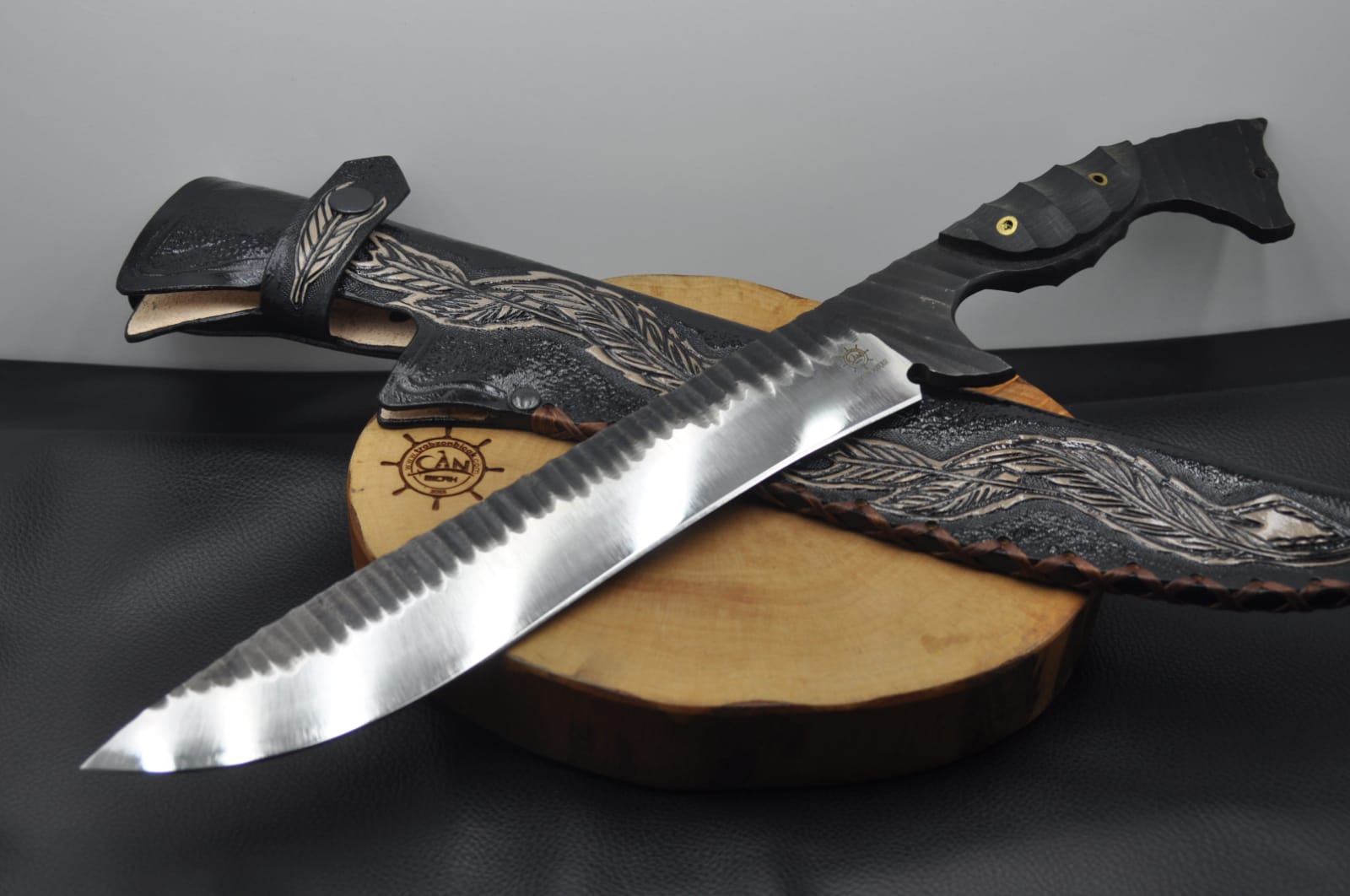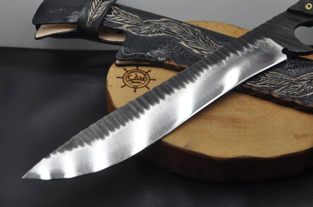 5160 kamyon makas çeliğinden dövme oymalı namlu, compact lamine kabza, craft deri kılıflı el yapımı av ve kamp bıçağı.