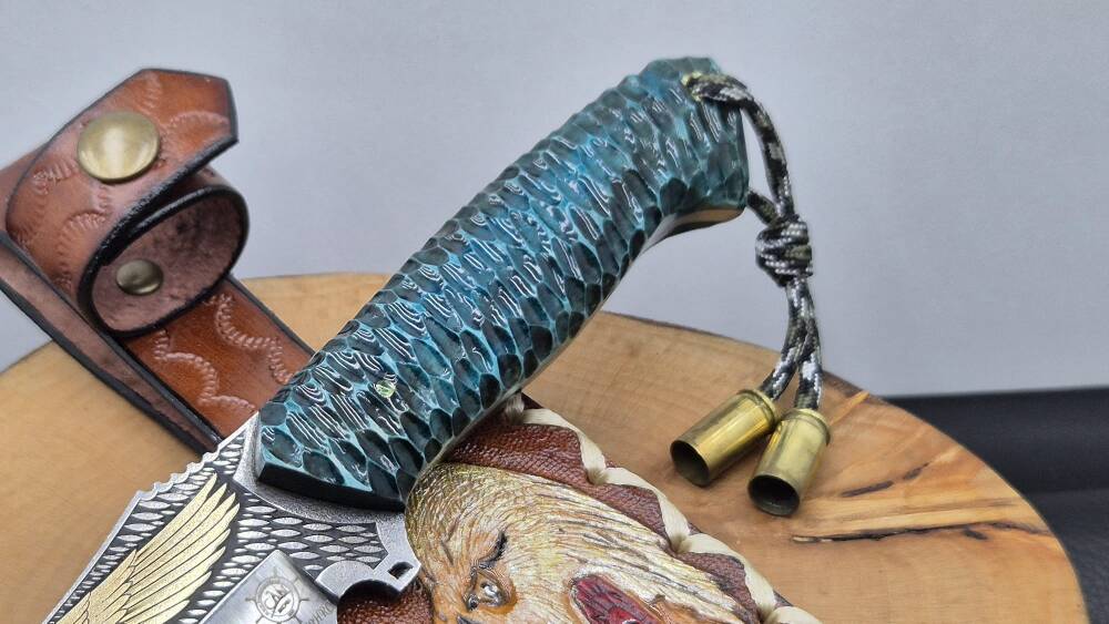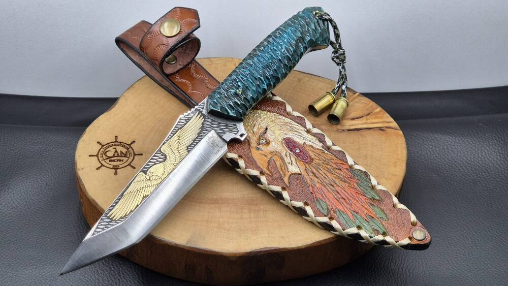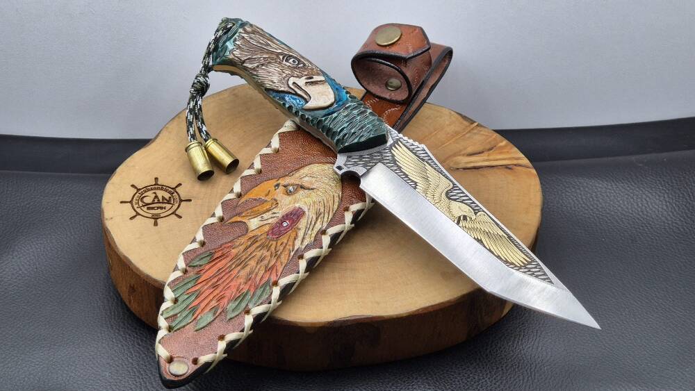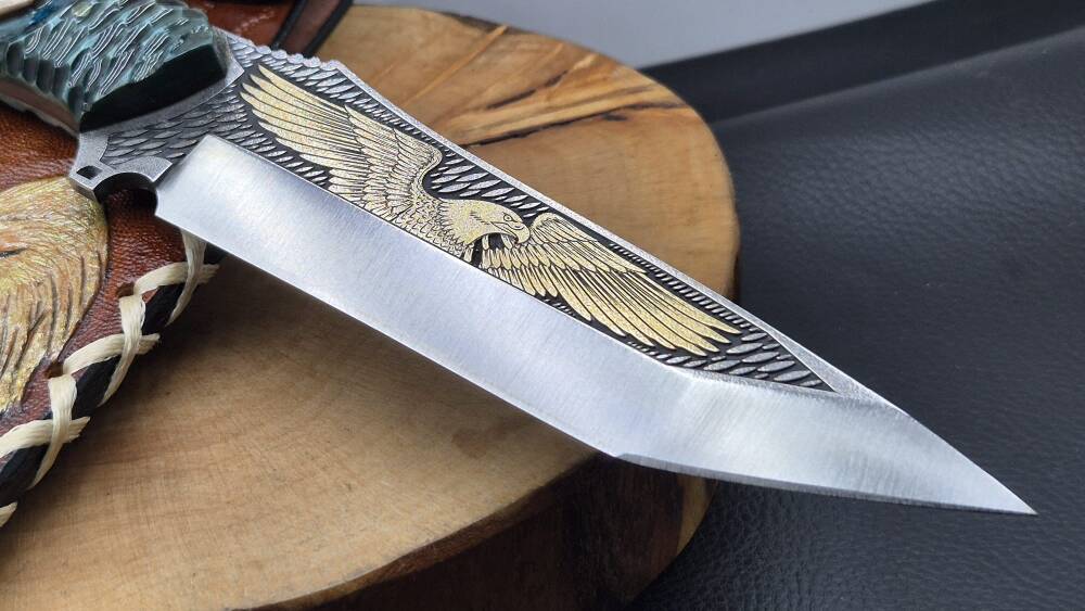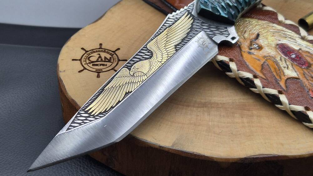 14K Altın kartal işleme gravür N690 Böhler çelik namlu, gravür işlemeli kartal benzetme corion kabza, kartal işlemeli craft deri kılıf, el yapımı av ve kamp bıçağı.
