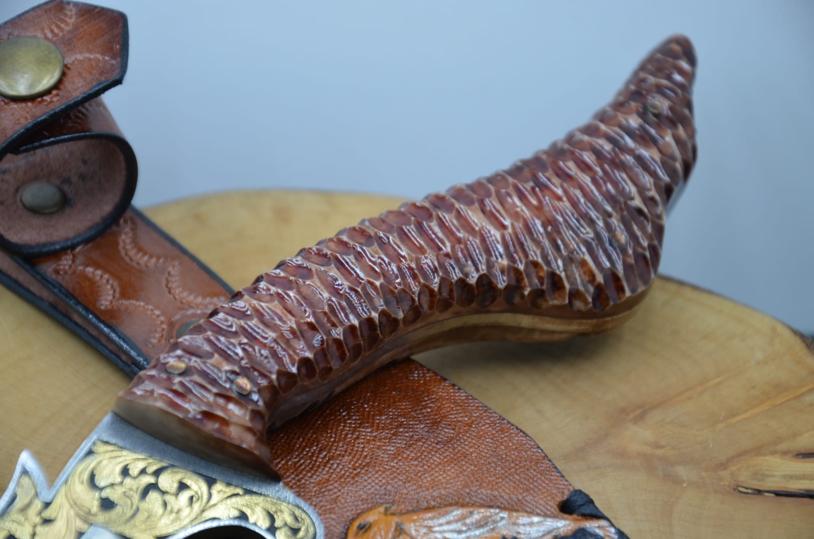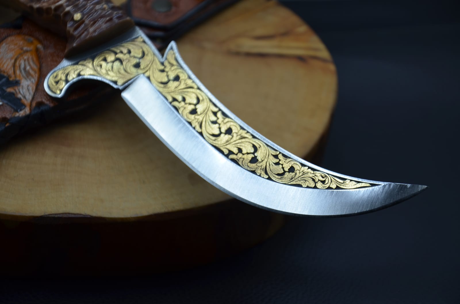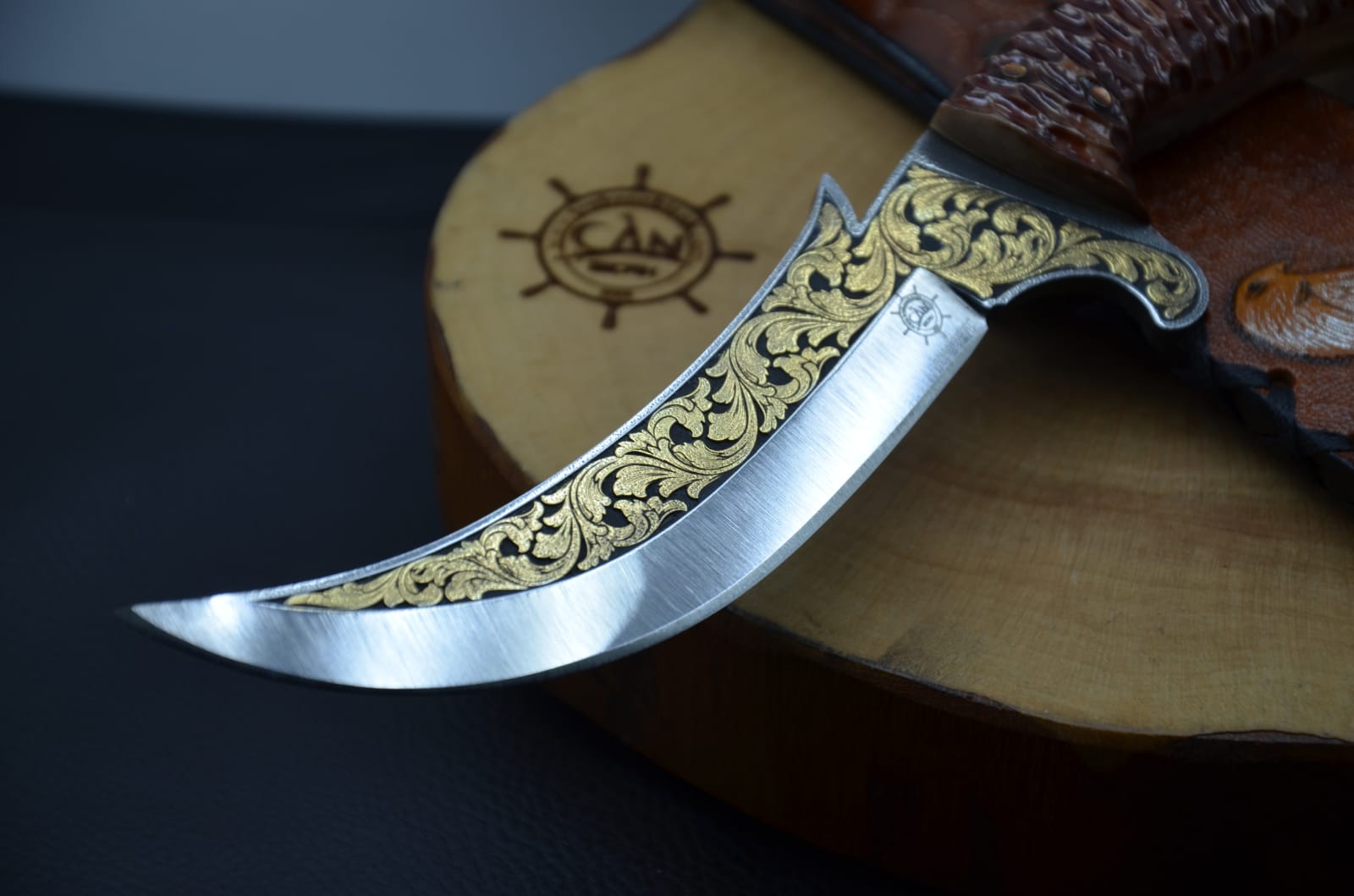 14K Altın tribal işleme gravür N690 Böhler çelik namlu, gravür işlemeli kartal benzetme corion kabza, kartal-çapa-dümen işlemeli craft deri kılıf, el yapımı av ve kamp bıçağı.