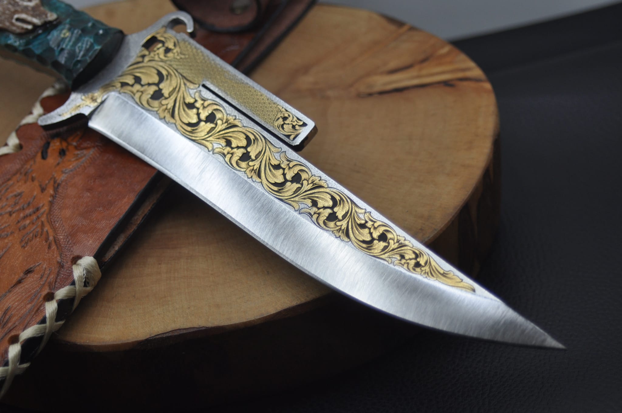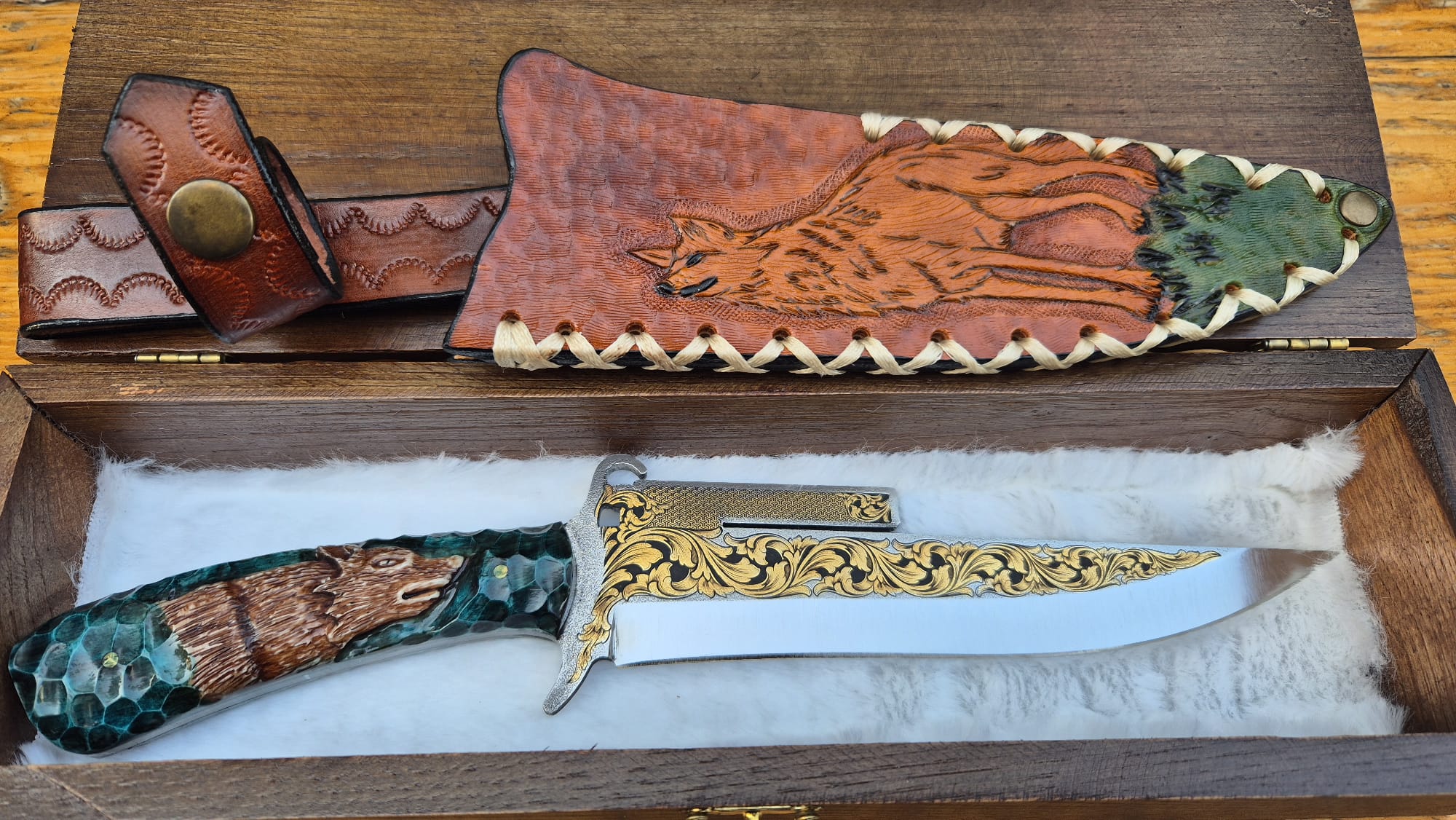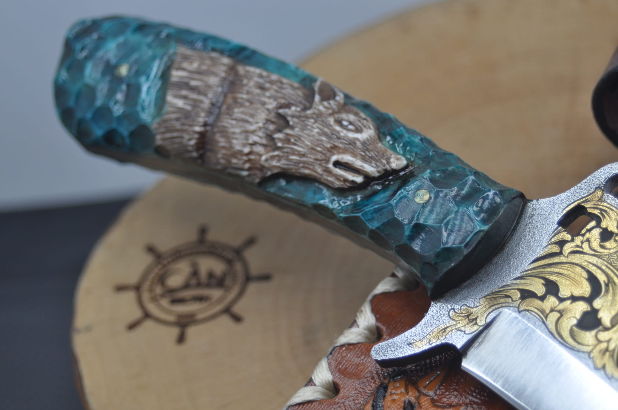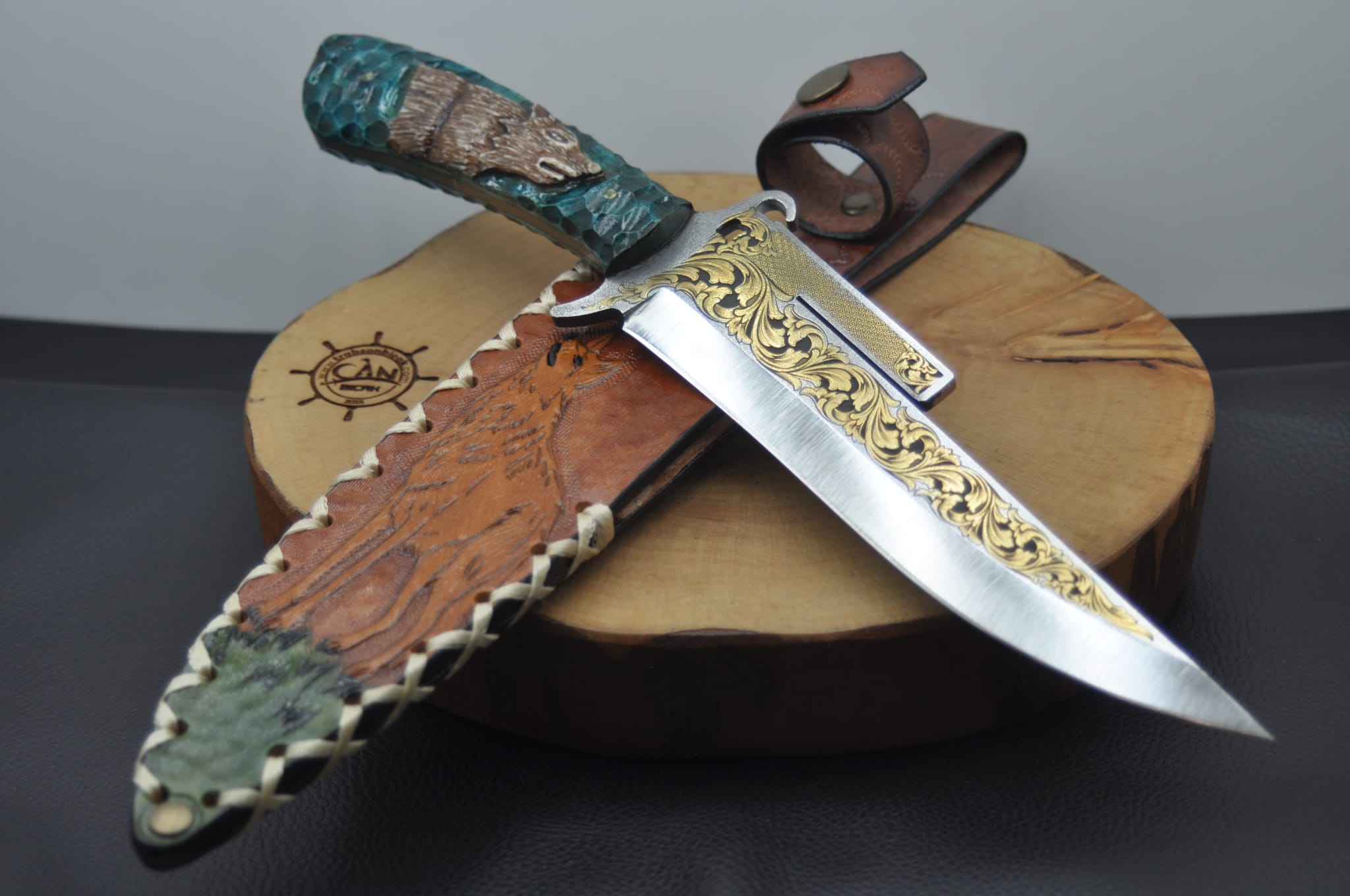 14K Altın tribal işleme gravür N690 Böhler çelik namlu, gravür işlemeli kurt benzetme corion kabza, kurt işlemeli craft deri kılıf, el yapımı av ve kamp bıçağı.