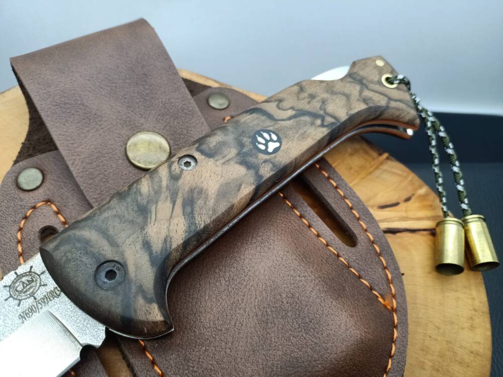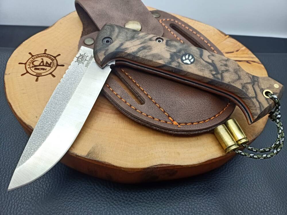 Nesmuk model, N690 Böhler çelik namlu, stabilize kabza, vaketa deri kılıf, paracord ip aksesuar-kovan kombin el yapımı av ve kamp bıçağı.