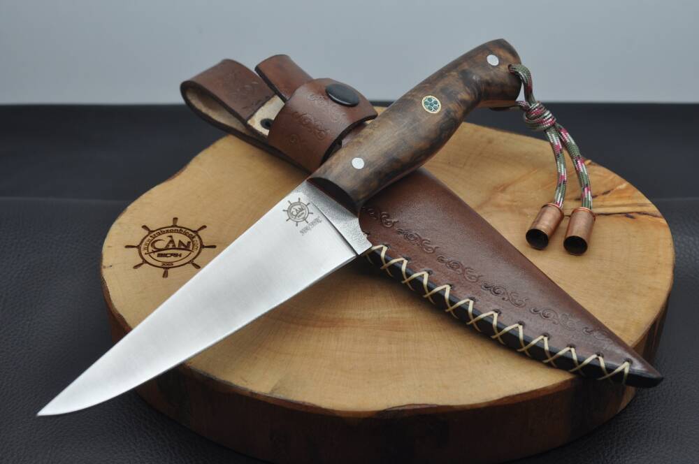 N690 Böhler çelik, stabilize akçaağaç kabza, sarı-kırmızı linear, vaketa deri kılıflı, paracord ip aksesuar-kovan kombin, el yapımı kemik sıyırma kasap bıçağı.