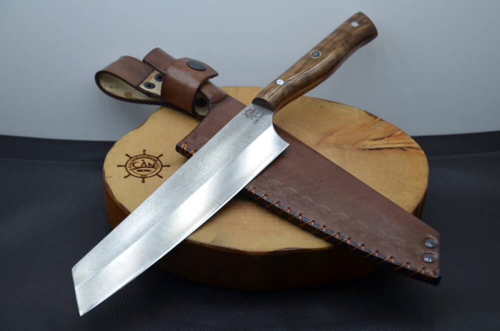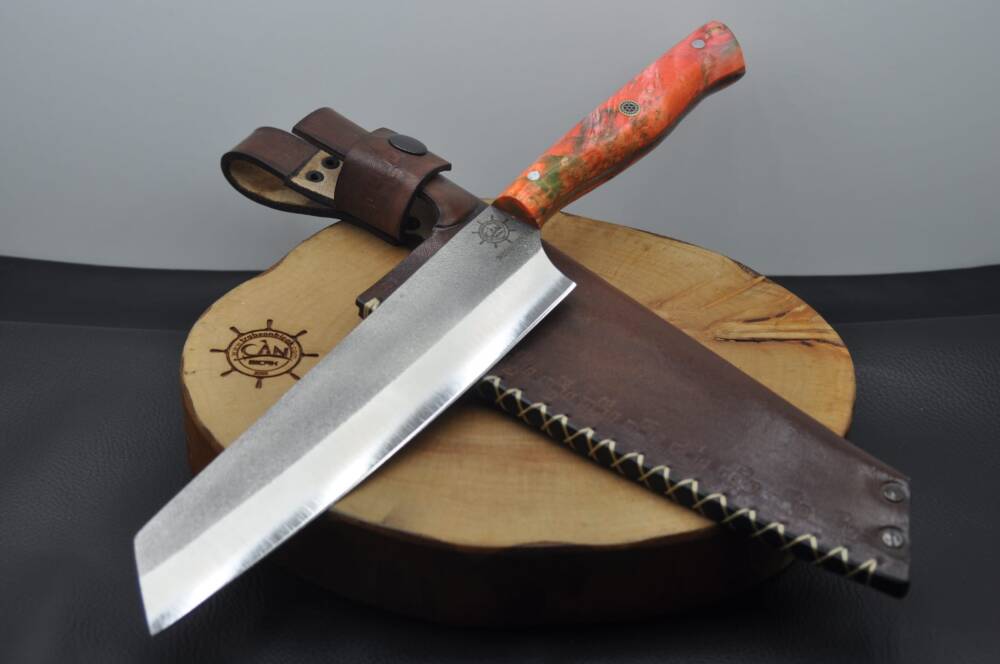 Nakiri model N690 Böhler çelik, stabilize kavak kabza, kırmızı linear, vaketa deri kılıflı, el yapımı Şef bıçağı.
