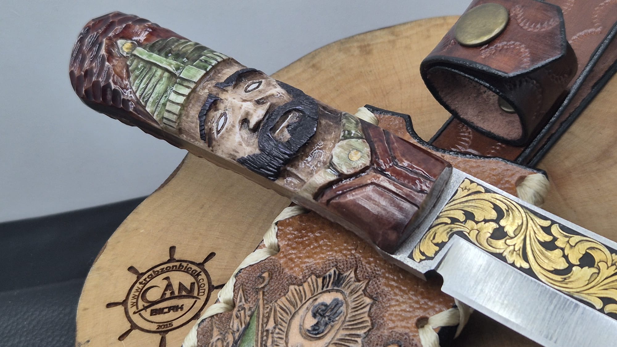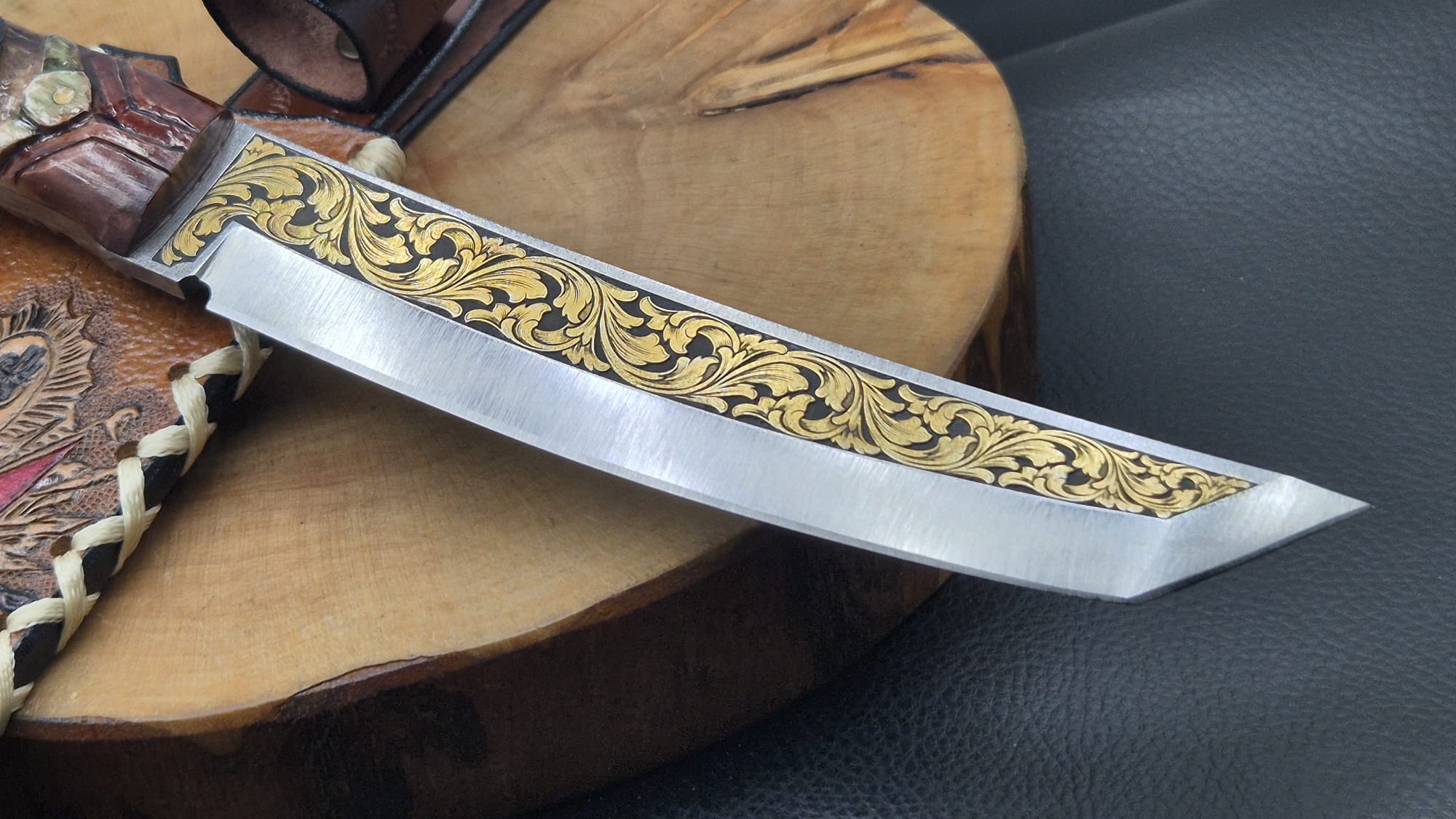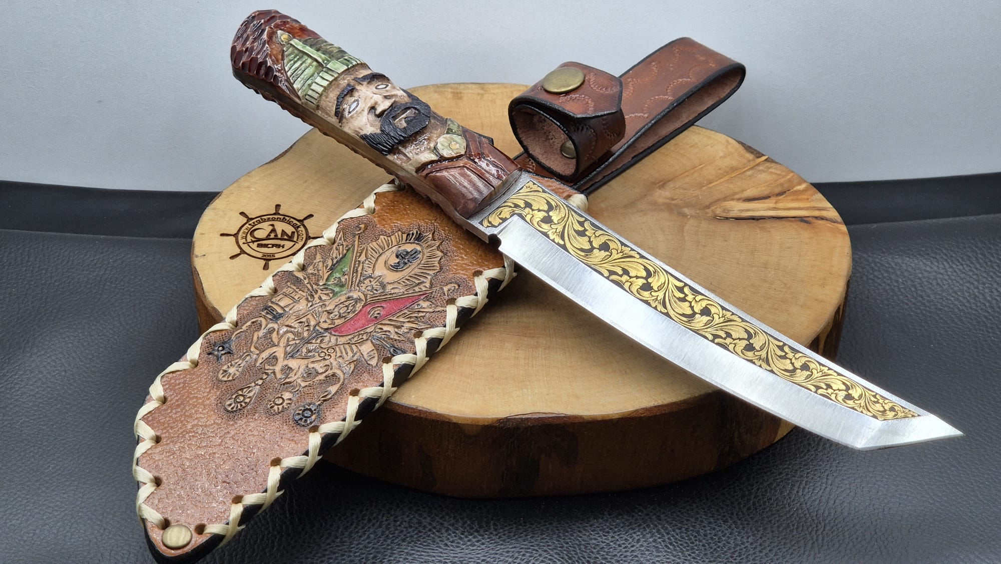 14K Altın tribal işleme gravür N690 Böhler çelik namlu, gravür işlemeli Osmanlı askeri benzetme corion kabza, Osmanlı tuğra işlemeli craft deri kılıf, el yapımı av ve kamp bıçağı.
