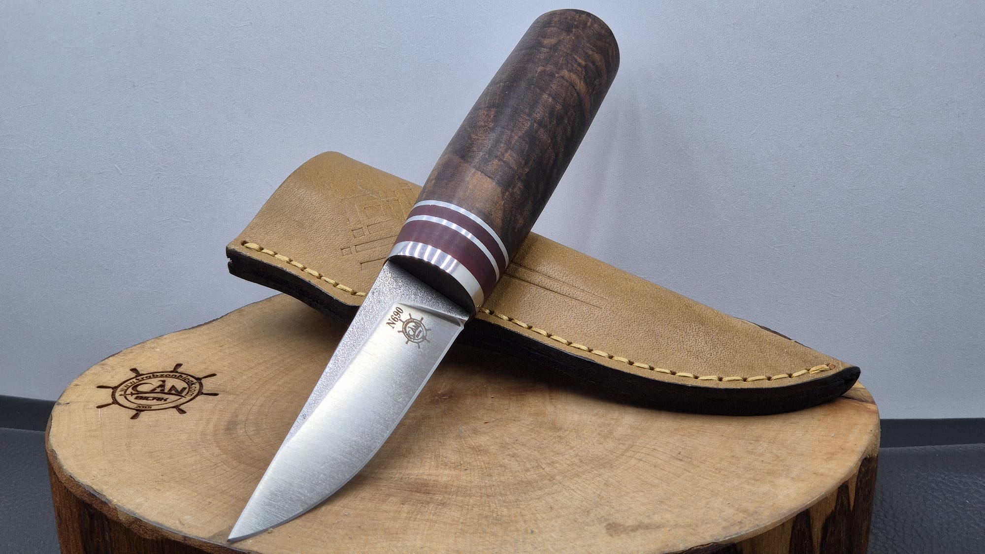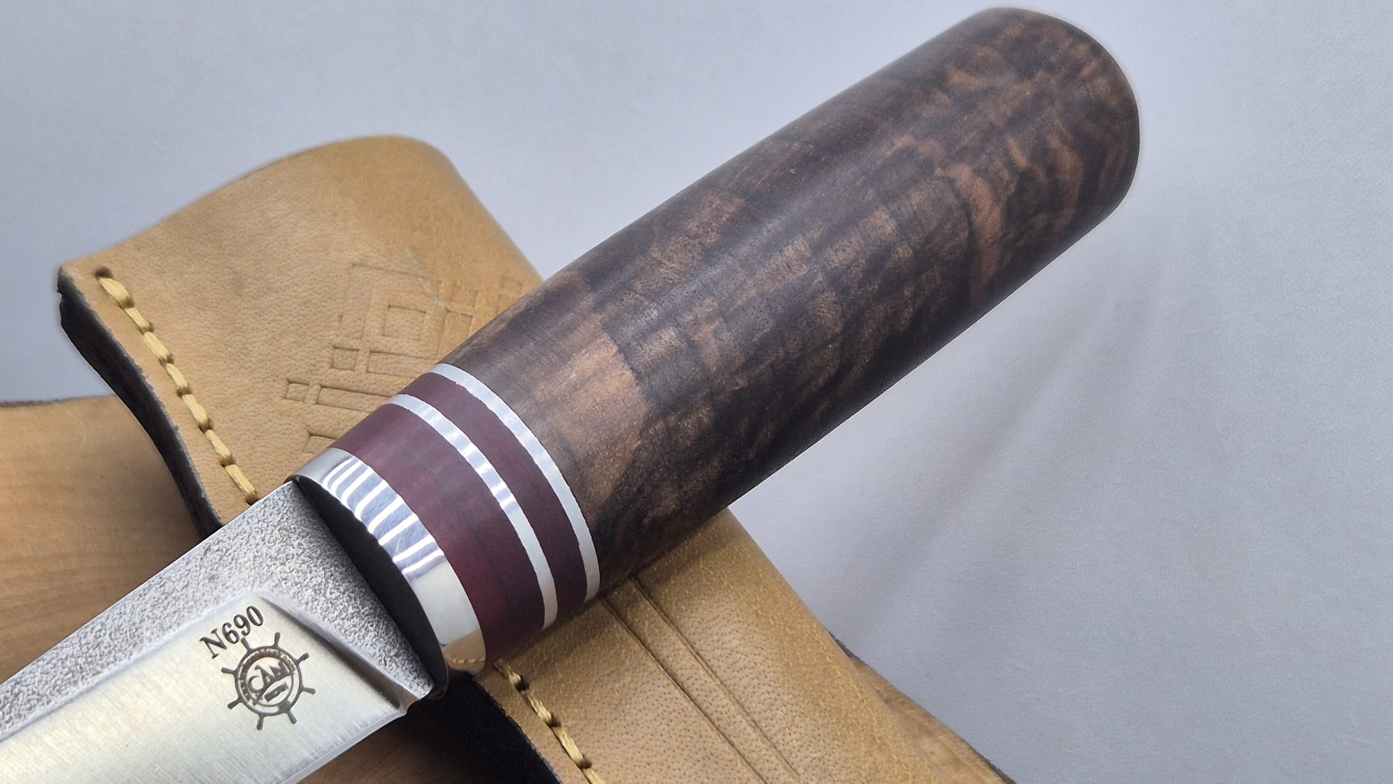Pukko model N690 Böhler çelik namlu,kökceviz ve paduk-krom parçalı kabza, vaketa deri kılıf, el yapımı av ve kamp bıçağı.