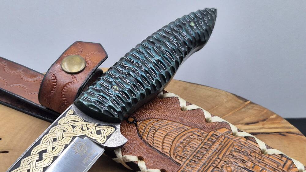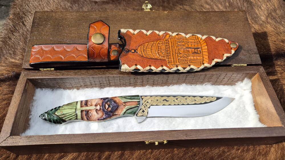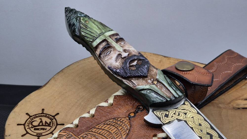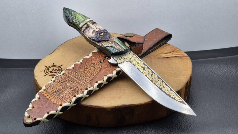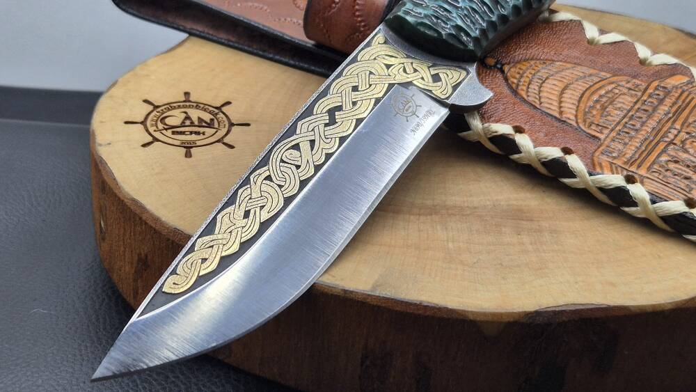 14K Altın tribal işleme gravür N690 Böhler çelik bushcraft model namlu, gravür işlemeli Selahaddin Eyyubi benzetme corion kabza, Kubbet-üs Sahra işlemeli craft deri kılıf, el yapımı av ve kamp bıçağı.