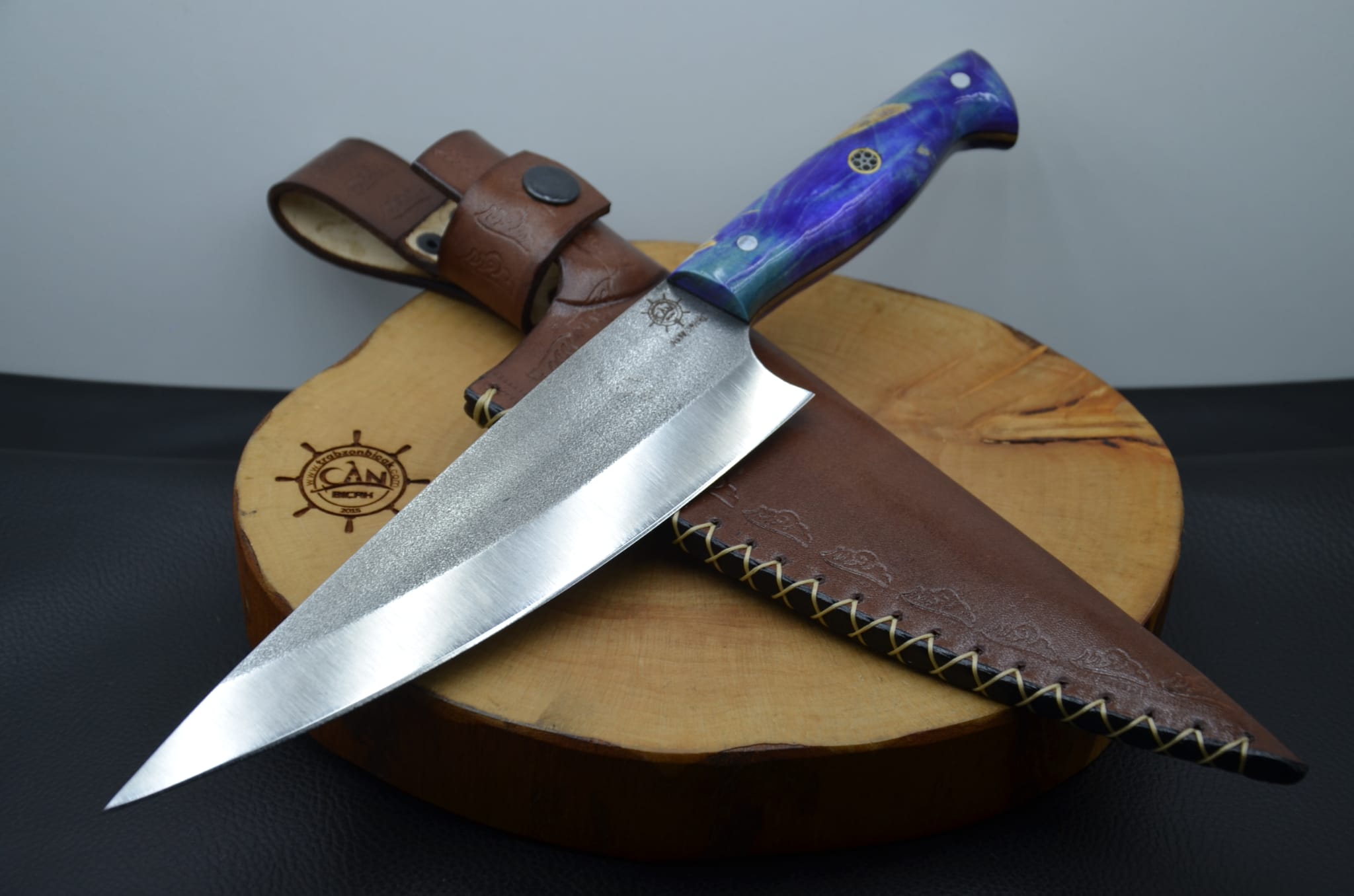 N690 Böhler çelik, stabilize kavak kabza, yeşil linear, vaketa deri kılıflı, el yapımı Şef bıçağı.