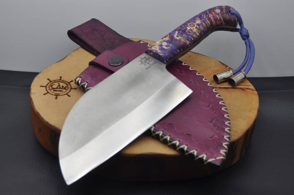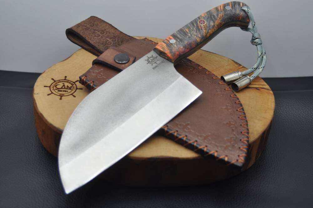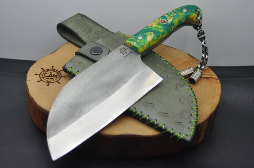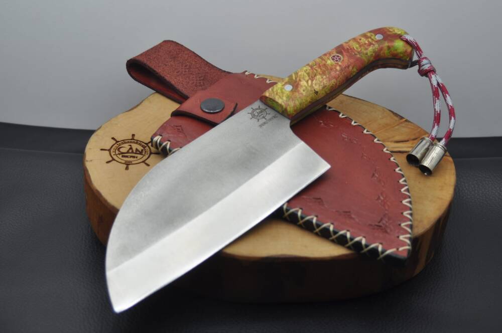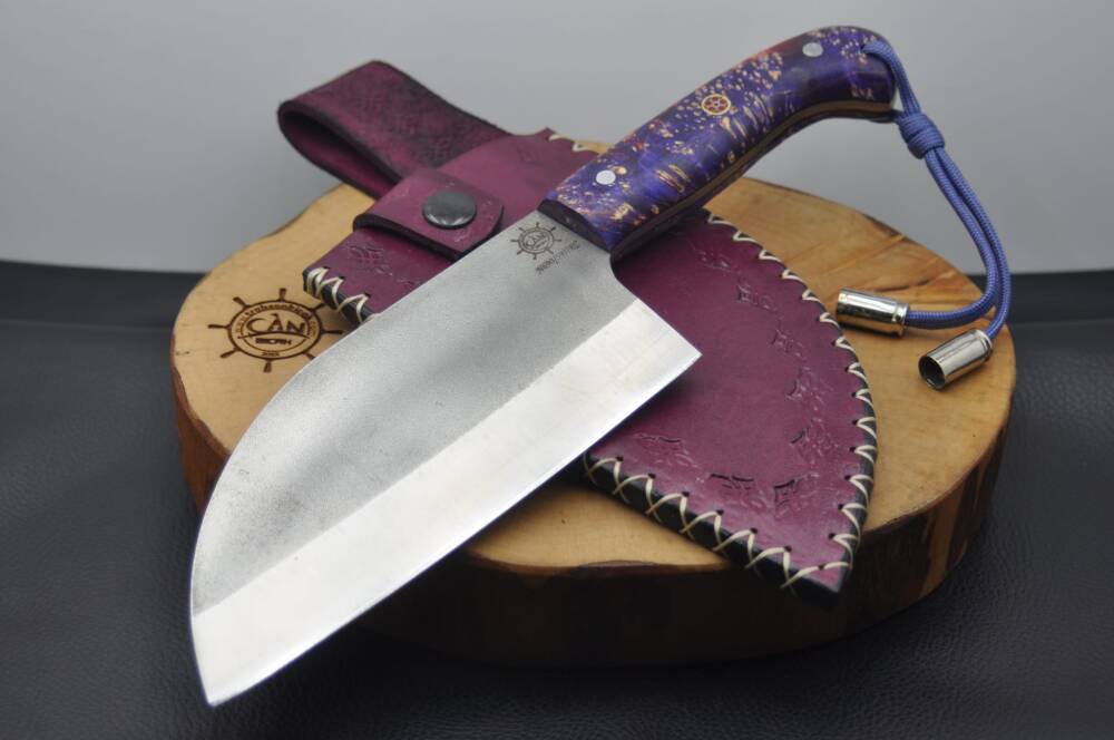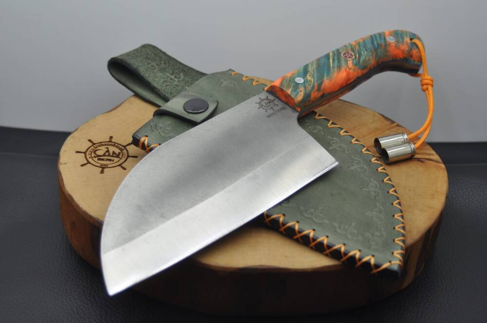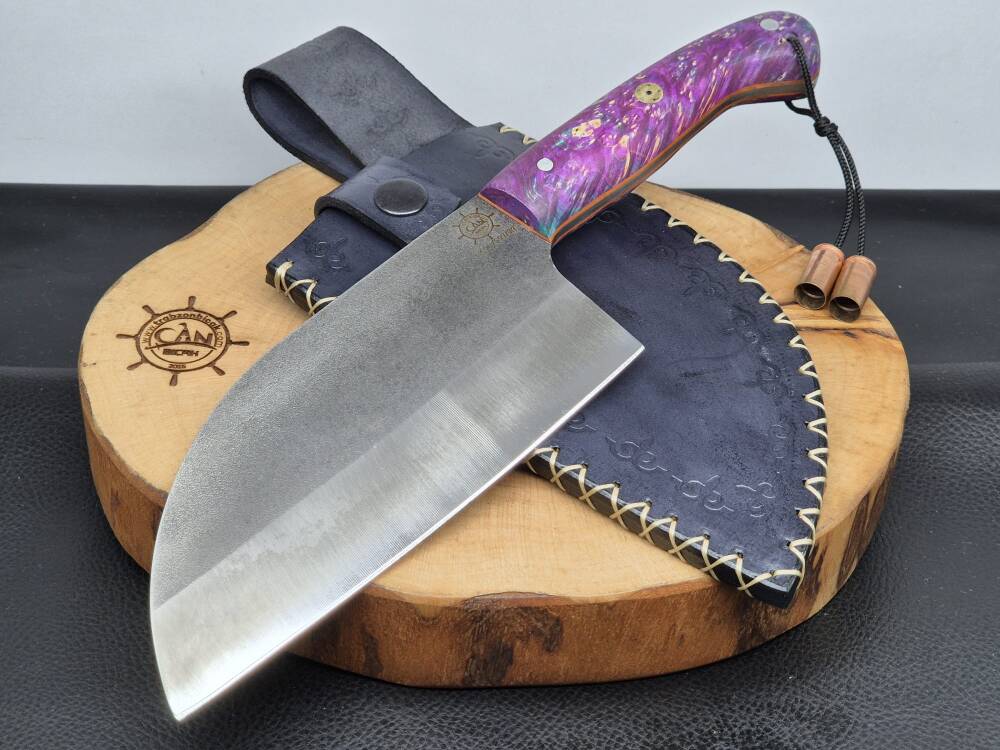 Almazan model N690 Böhler çelik, stabilize kabza, yeşil linear, vaketa deri kılıflı, el yapımı Şef bıçağı.