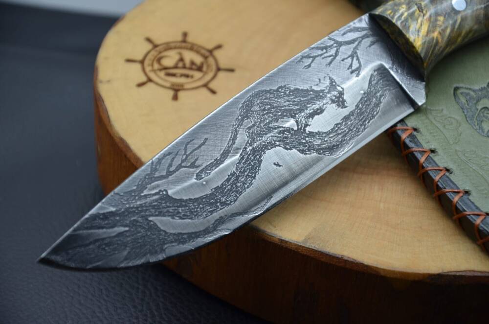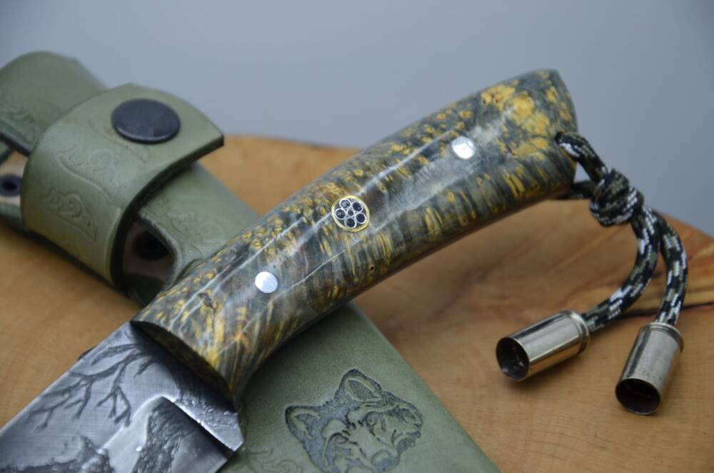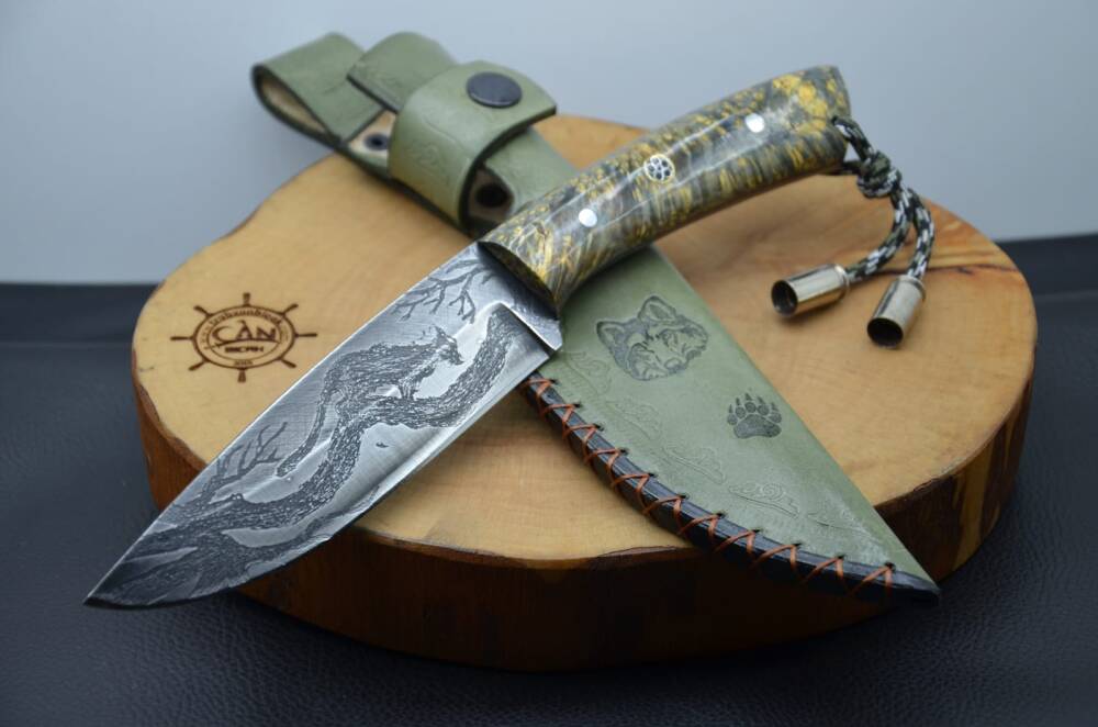 A2 Neşter Çelik asit indirme çift taraf gravür işlemeli namlu, stabilize akçaağaç kabza, siyah linear, mozaik pim, vaketa deri kılıflı, paracord ip aksesuar-kovan kombin, el yapımı av ve kamp bıçağı.