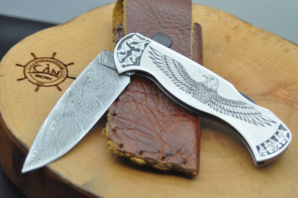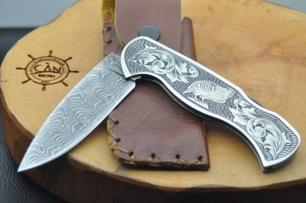 Damascus çelik namlu, gravür işleme krom kabza, sırttan kilitli, deri kılıflı el yapımı çakı.
