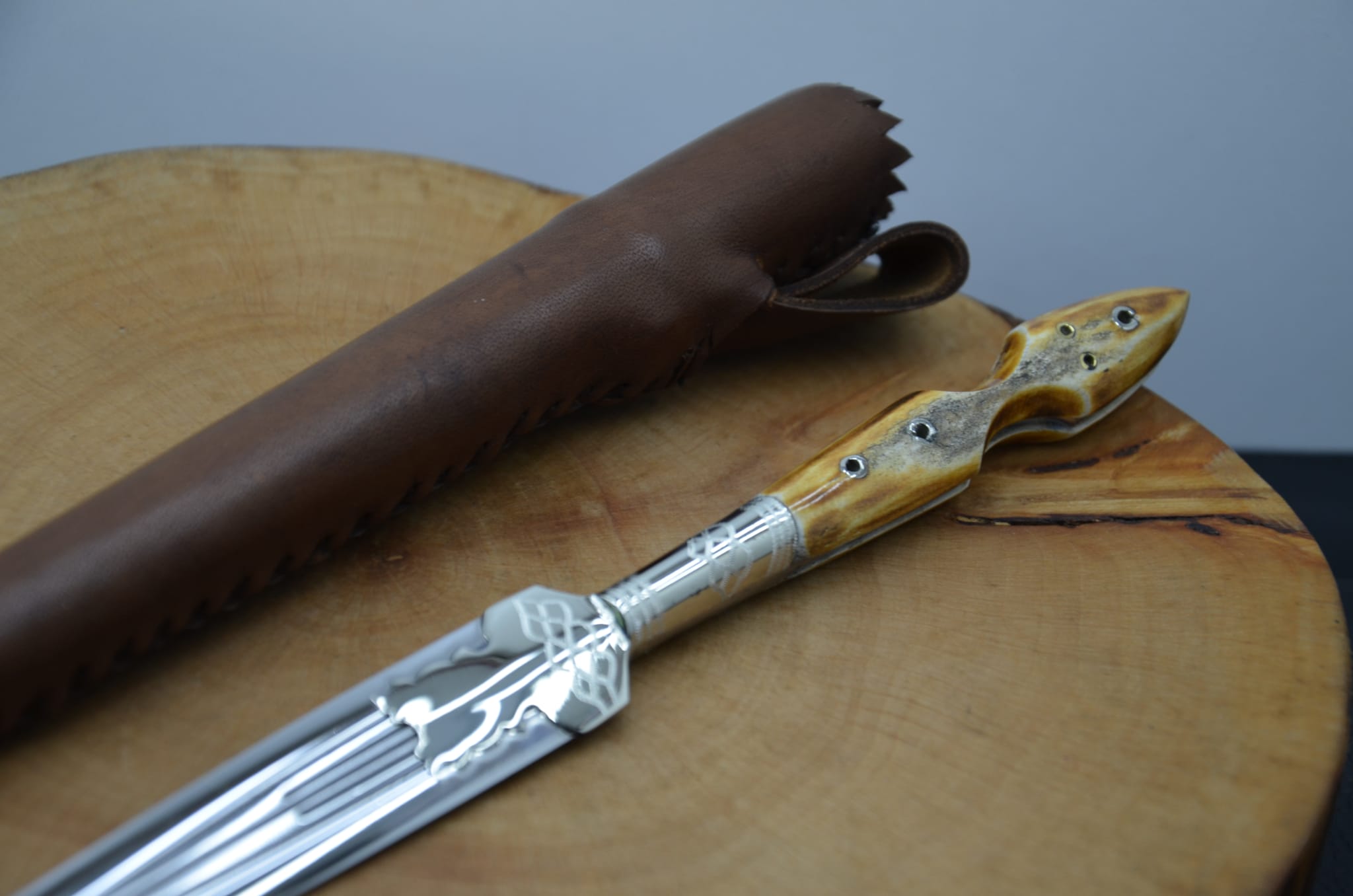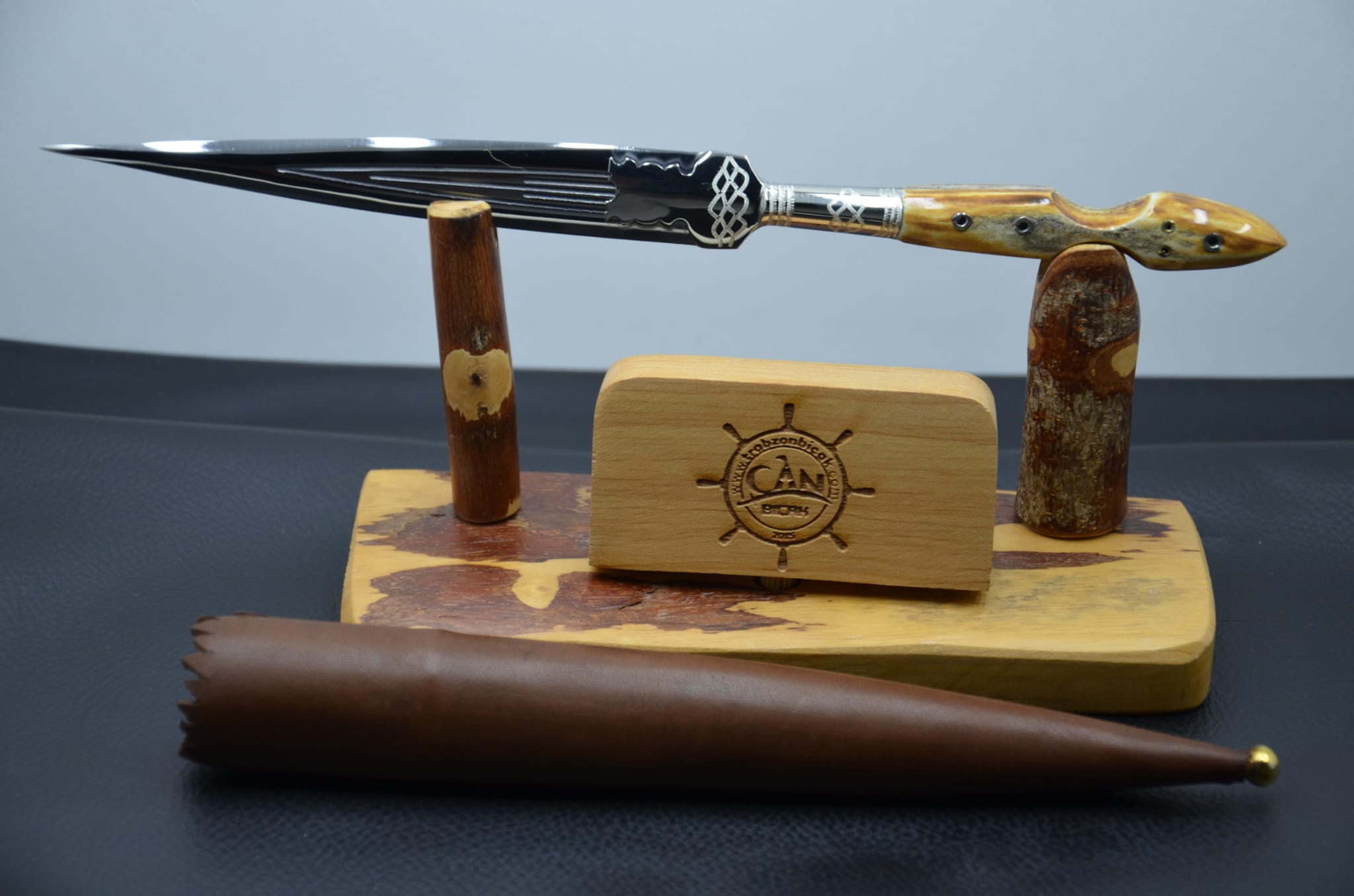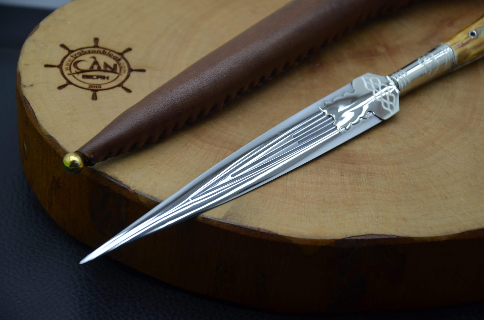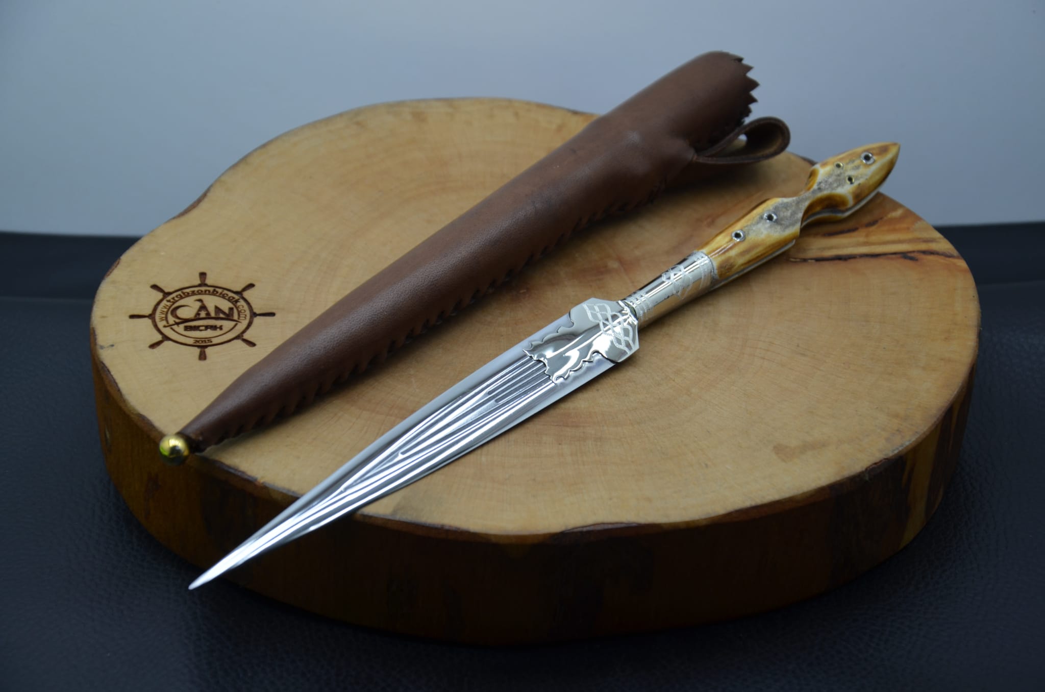 Geyik boynuzu kabza, 4116 çelik, gümüş bafon uygulama işlemeli önlük, ahşap üzeri deri kaplama kılıf Sürmene Teklisi.