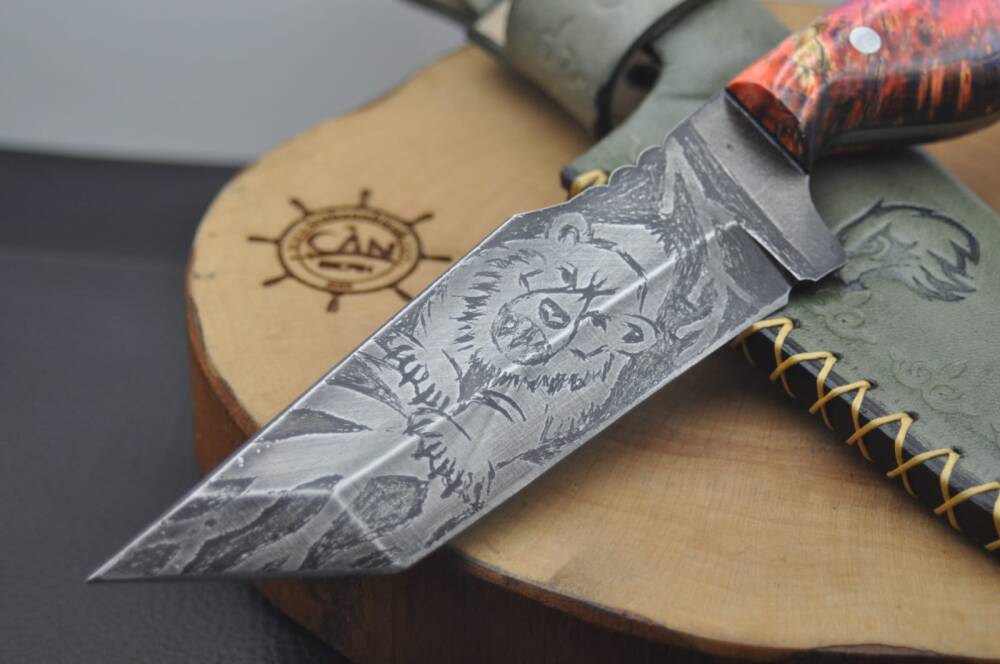 A2 Neşter Çelik asit indirme çift taraf gravür işlemeli namlu, stabilize akçaağaç kabza, siyah linear, mozaik pim, vaketa deri kılıflı, paracord ip aksesuar-kovan kombin, el yapımı av ve kamp bıçağı.